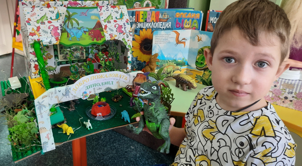Мальчику захотелось объединить все самое лучшее, что он увидел, и сделать парк динозавров. Он спросил у своих друзей, что бы они хотели увидеть в «Диноленде». Ребята отвечали: динозавров, аттракционы, кафе. Это и многое другое дошкольник сделал в своем проекте.