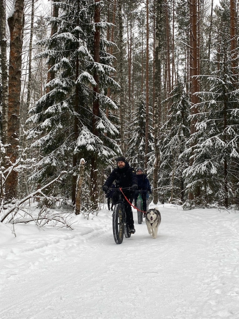 Да, с Улой. Есть такой вид спорта – байк-джоринг. С помощью специальных приспособлений собака как бы «впрягается» в велосипед и везет ездока. Когда Ула помладше была, я вообще педали не крутил, сейчас помогаю ей педалями.