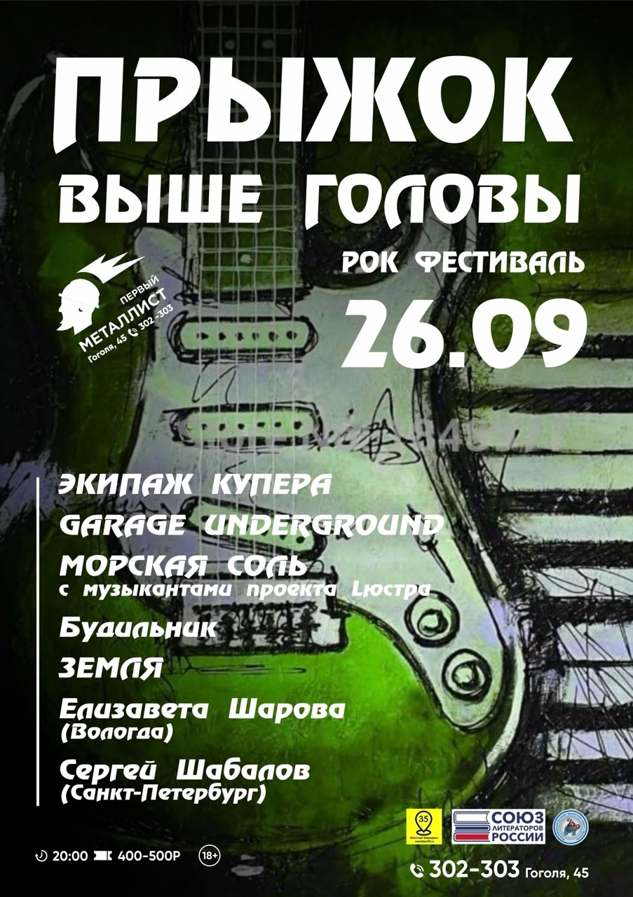 Стартуем уже вечером в пятницу, 26 сентября, на рок-фестивале «ПРЫЖОК ВЫШЕ ГОЛОВЫ» в «Первом Металлисте». В этот раз здесь выступят: ЭКИПАЖ КУПЕРА, GARAGE UNDERGROUND, МОРСКАЯ СОЛЬ с музыкантами проекта Lюстра, группа «Будильник», группа «ЗЕМЛЯ», Елизавета Шарова (Вологда), Сергей Шабалов (Санкт-Петербург). Начало в 20.00. Билеты на входе.