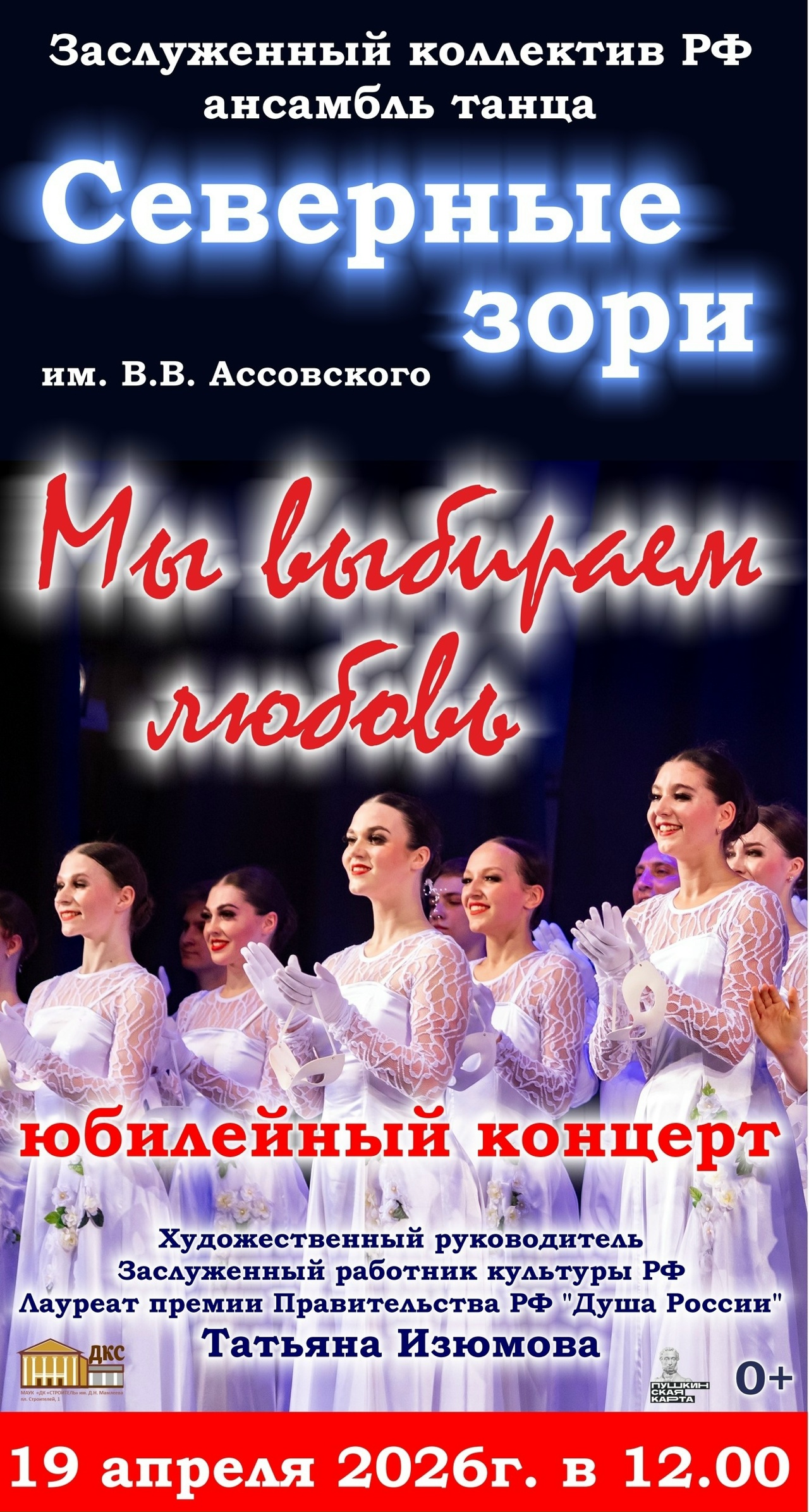 12:00 - праздничный концерт «Мы выбираем любовь» (0+), посвящённый 60-летию Заслуженного коллектива РФ ансамбля танца им. В.В. Ассовского под руководством Татьяны Изюмовой «Северные зори», посвящённый 60-летию коллектива в ДК «Строитель».