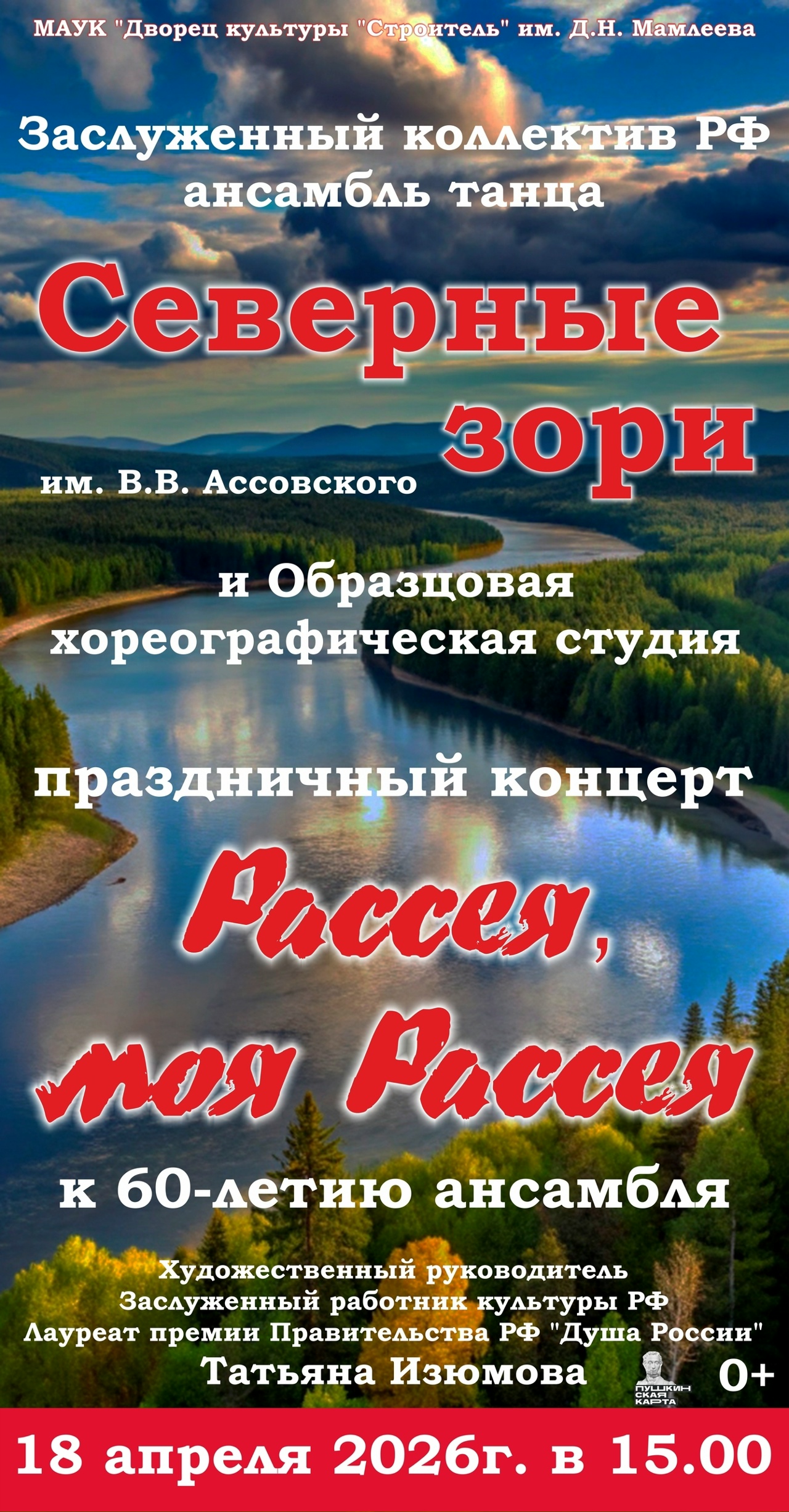 15:00 - праздничный концерт «Рассея, моя Рассея» (0+), посвящённый 60-летию Заслуженного коллектива РФ ансамбля танца им. В.В. Ассовского под руководством Татьяны Изюмовой «Северные зори» в ДК «Строитель».