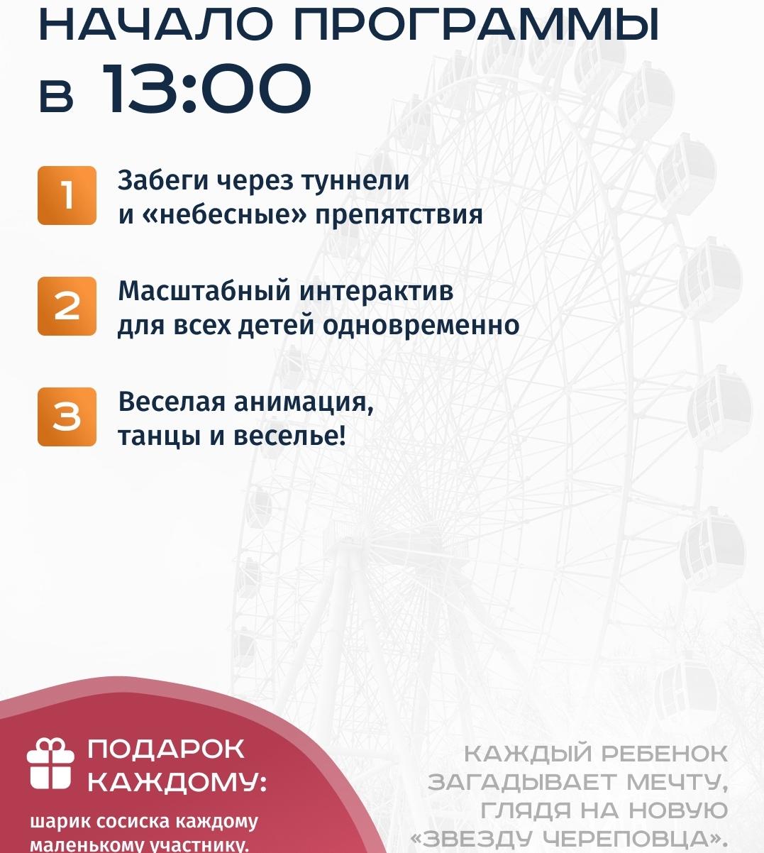 Колесо обозрения «Звезда Череповца» (2+) снова засияет в городе — 18 апреля в 13:00 у колеса запланирован большой праздник с музыкой, анимацией и интерактивами.