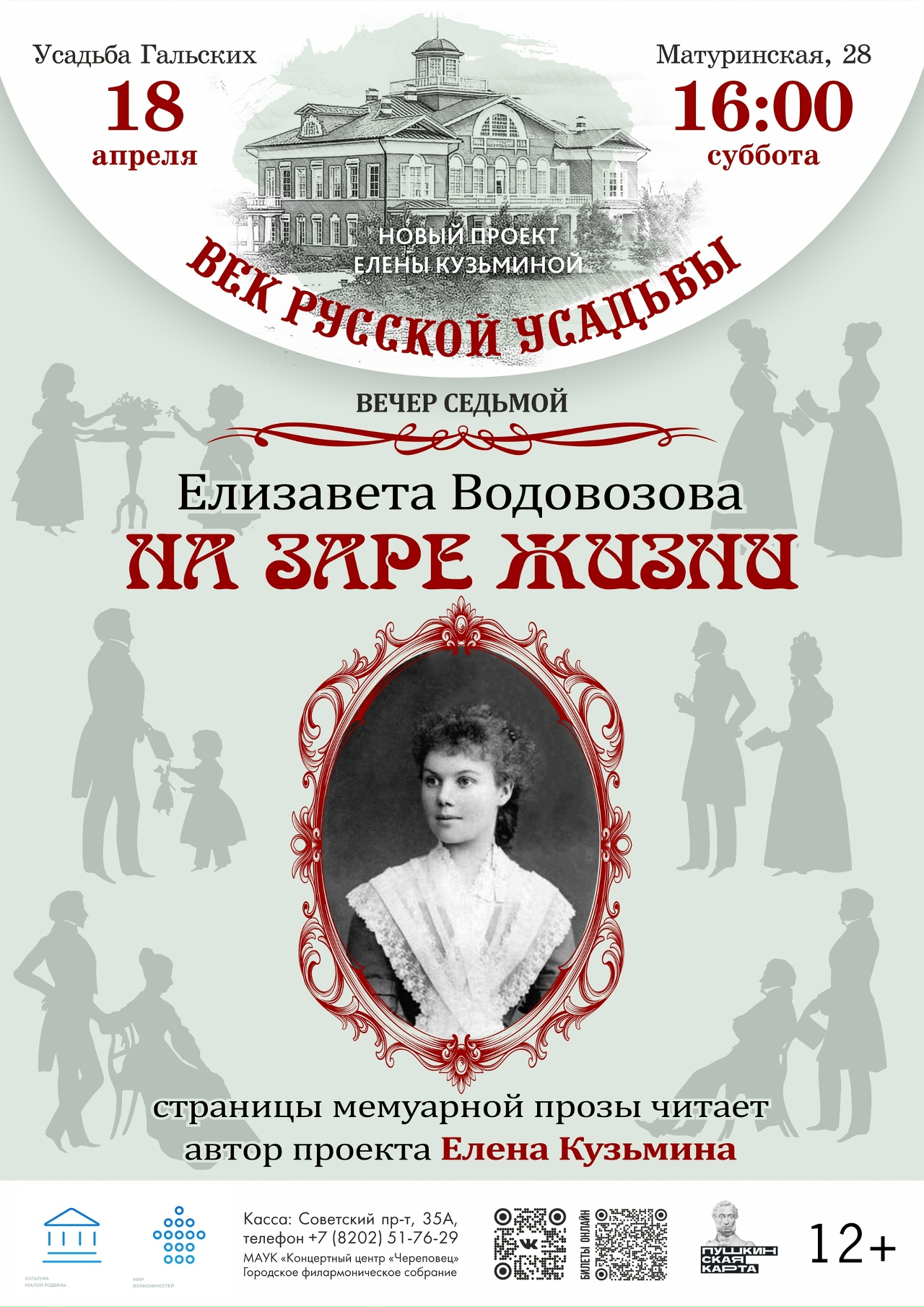 18 апреля (сб) 16:00 - цикл «Век русской усадьбы» - седьмой вечер посвящён Елизавете Водовозовой и её мемуарам «На заре жизни».
