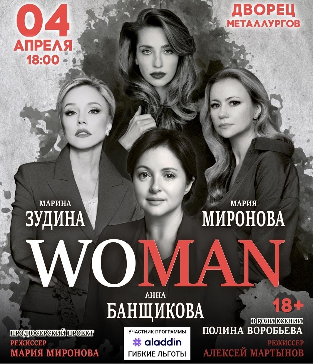 - 18:00 — спектакль WOMAN (18+), в ролях: Мария Миронова, Анна Банщикова, Максим Лагашкин и другие звёзды театра и кино. Дворец металлургов.