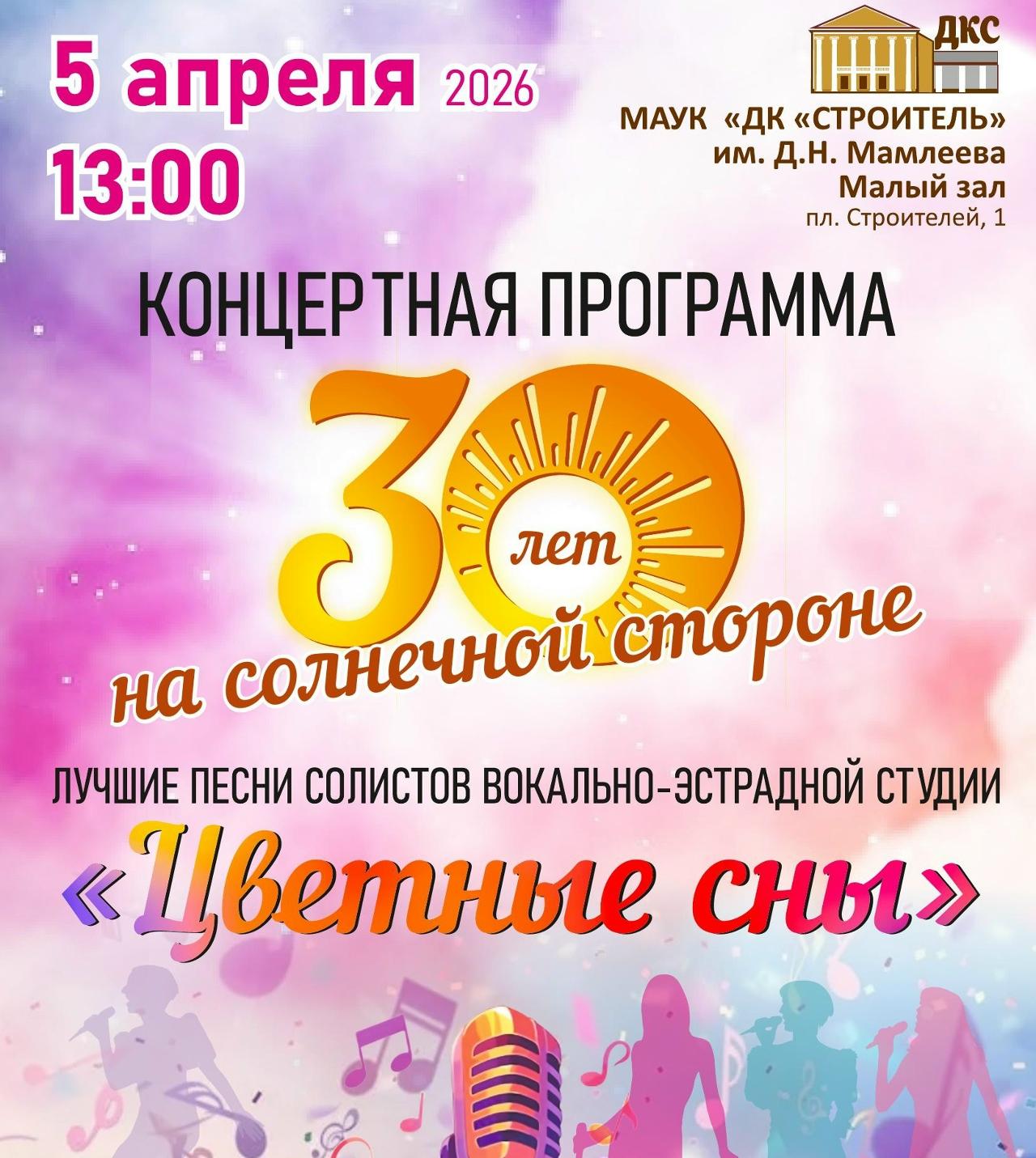 - 13:00 — концертная программа «30 лет на солнечной стороне» (0+) от вокально-эстрадной студии «Цветные сны». ДК «Строитель», малый зал.