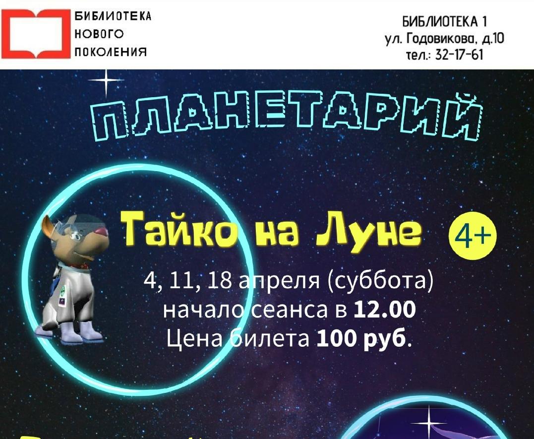 - 12:00 — планетарий в Библиотеке № 1 (ул. Годовикова, 10) с программой «Тайко на Луне» (4+).