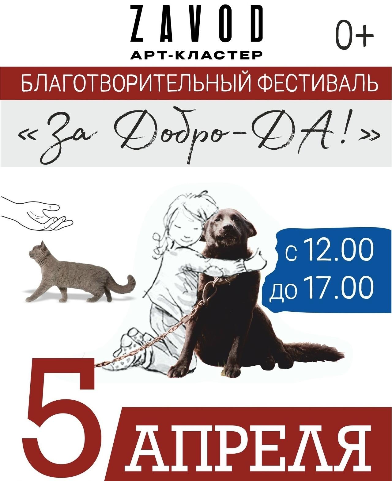 - С 12:00 до 17:00 — благотворительный фестиваль «За добро — Да!» (0+) в поддержку приютов для животных. Арт-кластер «Завод» (Гоголя, 45).