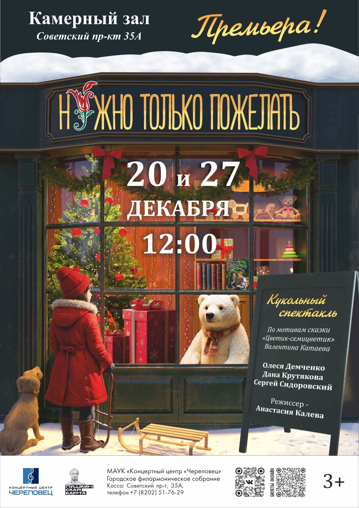 12:00 – в Камерном зале (пр. Советский, 35а) новогодний кукольный спектакль по мотивам сказки «Цветик-семицветик» (3+).