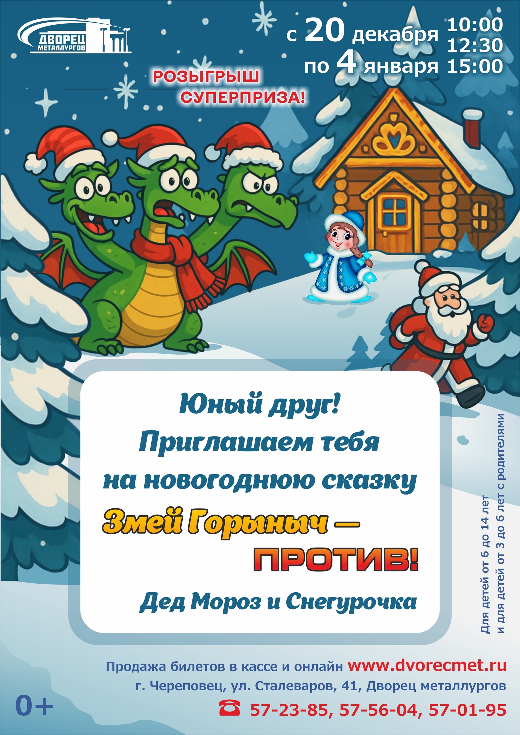 С 20 декабря по 4 января во Дворце металлургов покажут новогоднюю сказку «Змей Горыныч - против!» (0+). Это современный спектакль с любимыми Дедом Морозом, Снегурочкой и представлением от цирка «Супер-Скок». Сеансы: 10:00; 12:30; 15:00.