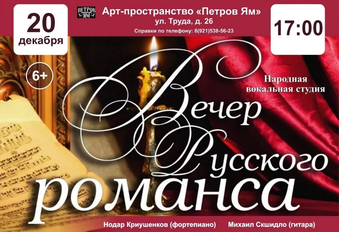 17:00 - в арт-пространстве «Петров Ям» (ул. Труда, 26) музыкальный «Вечер русского романса» (6+).