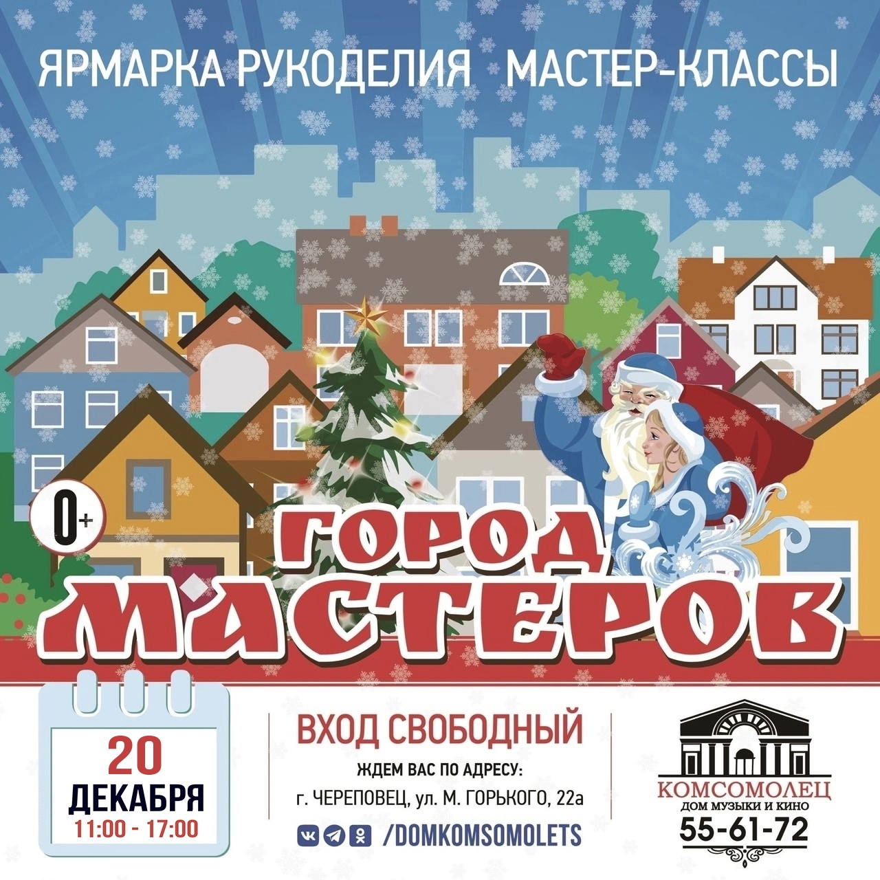 11:00 - 17:00 в ДМиК «Комсомолец» пройдет ярмарка рукоделия «Город мастеров» (0+). Декабрьская ярмарка посвящена Новому году. Вход бесплатный. В фойе будут работать мастер-классы. Здесь же в 12:00 пройдёт детская концертно-игровая программа «Новогодний переполох» (0+).