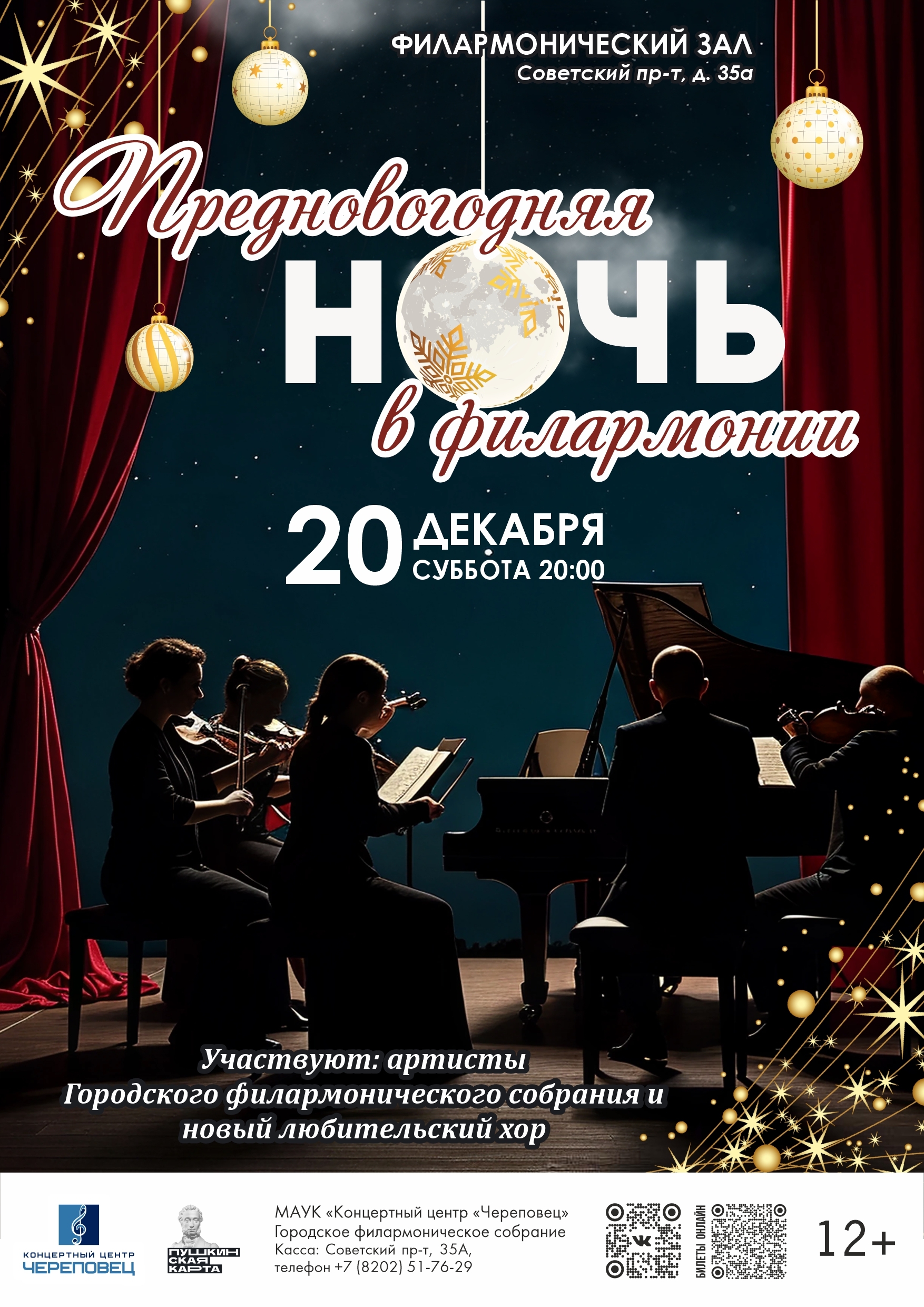 20:00 – в Филармоническом зале (пр. Советский, 35а) предновогодняя «Ночь в филармонии» (12+). Участники: артисты городского филармонического собрания и новый любительский хор.