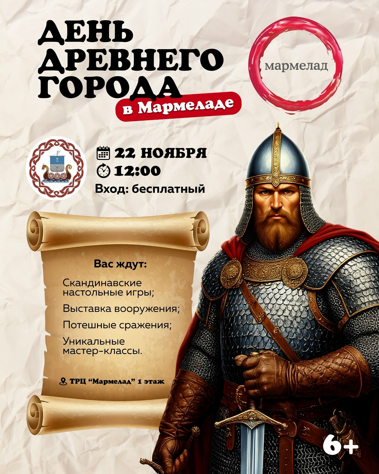 В 12:00 в ТРЦ «Мармелад» на 1 этаже (Октябрьский проспект, 25а) пройдёт «День Древнего города» (6+). В программе: выставка вооружения, потешные сражения, скандинавские настольные игры и мастер-классы. Организатор — Клуб исторической реконструкции «Белозерская дружина». Участие бесплатное.