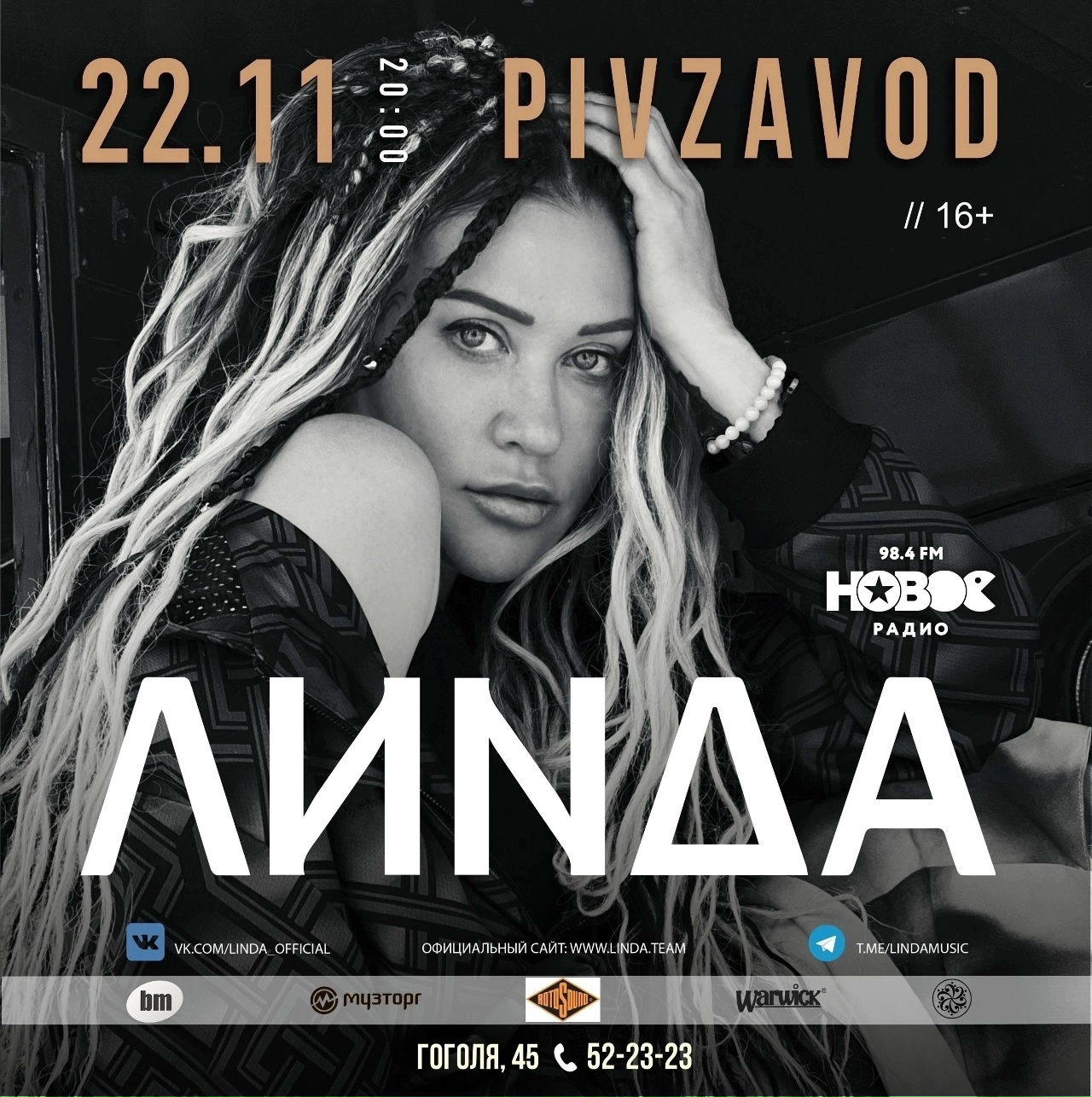В 20:00 в «Арт-кластере ZAVOD» (бывший PIVZAVOD, ул. Гоголя, 45) — концерт уникальной певицы Линды (16+).