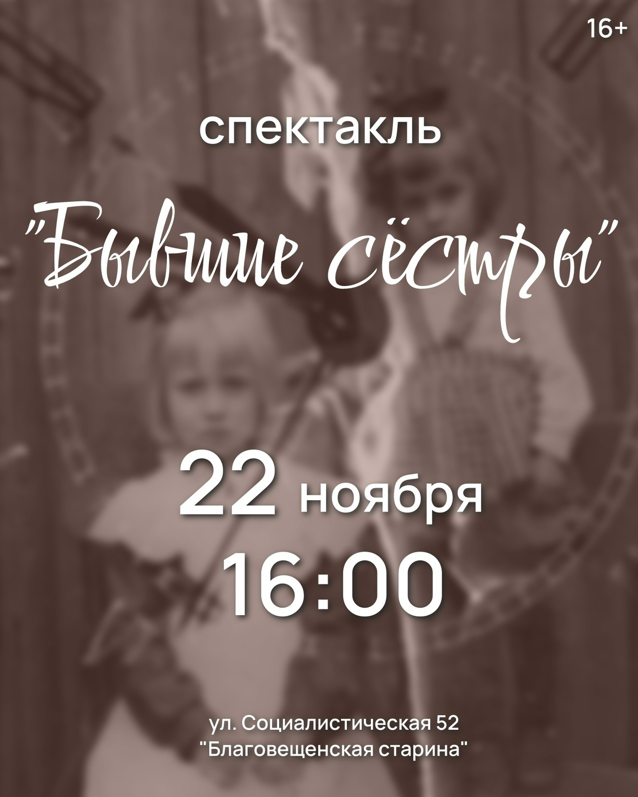 В 16:00 в «Благовещенской старине» (ул. Социалистическая, 52) — спектакль по пьесе Андрея Васильева «Бывшие сёстры» (16+). Постановку представляет череповецкий театральный коллектив «Созвездие». Запись и подробности по телефону: 600-125.