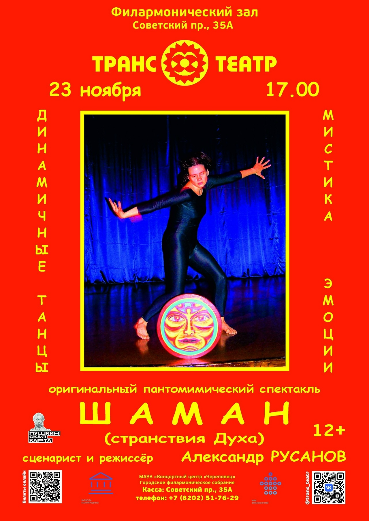 В 17:00 в Филармоническом зале — пантомимический спектакль Транс-Театра «Шаман. Странствия духа» (12+) о духовном путешествии человека, ищущего смысл жизни в учениях Востока.