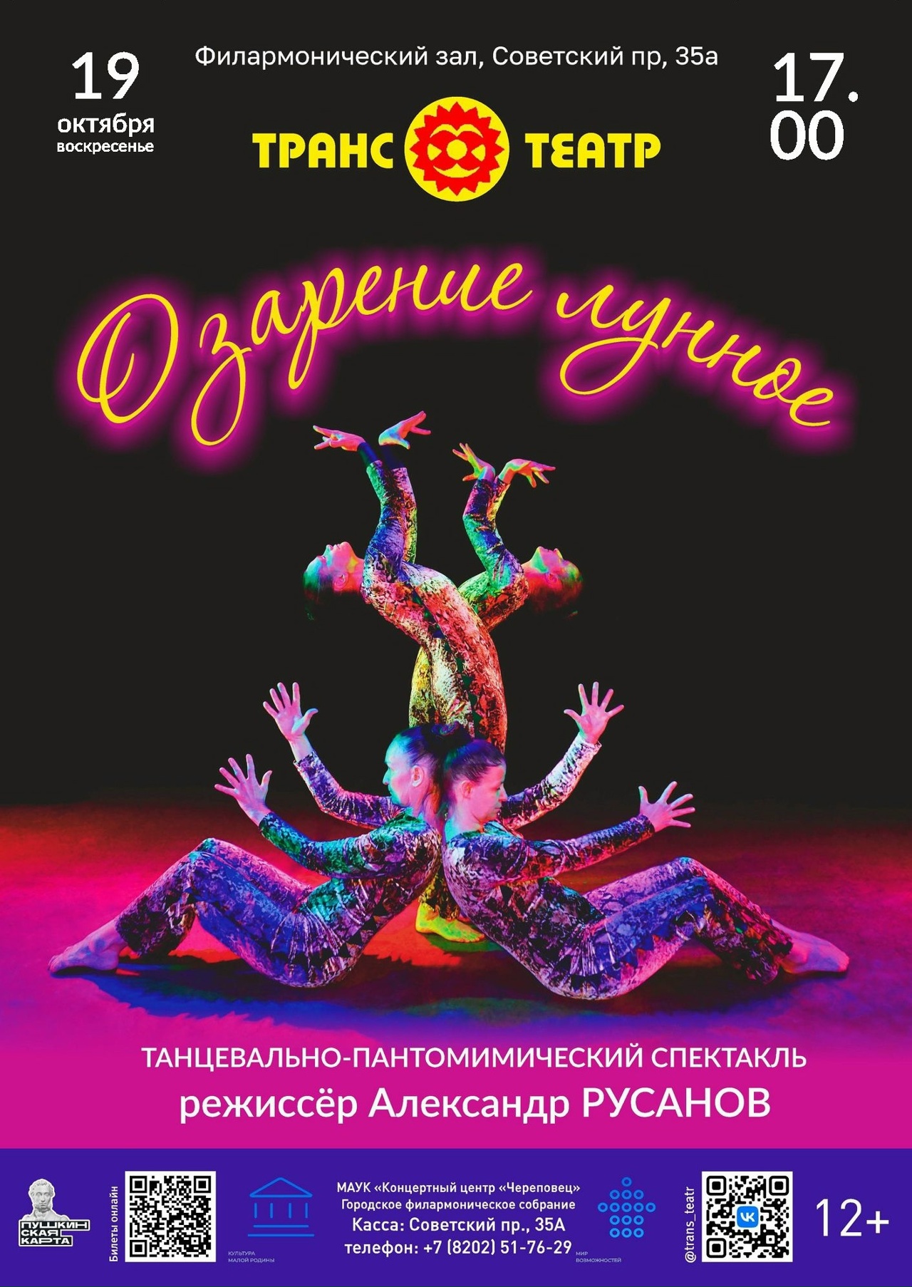 17:00 - танцевально-пантомимический спектакль Транс-театра «Озарение лунное» (12+) – это удивительный сплав поэзии, музыки и движения.