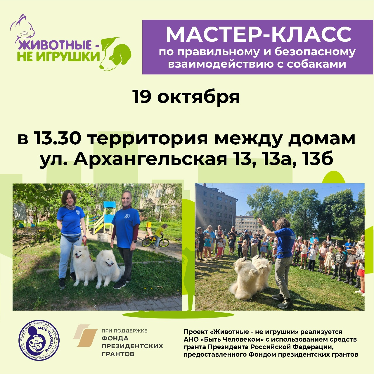 На мастер-классе вы узнаете, как собачки общаются с нами; ознакомитесь с техникой безопасности при общении с собаками, которую должны знать и дети, и взрослые, посмотрите на красивых, добрых, воспитанных собак и даже сможете с ними сфотографироваться. Проект «Животные - не игрушки» реализуется АНО «Быть Человеком».