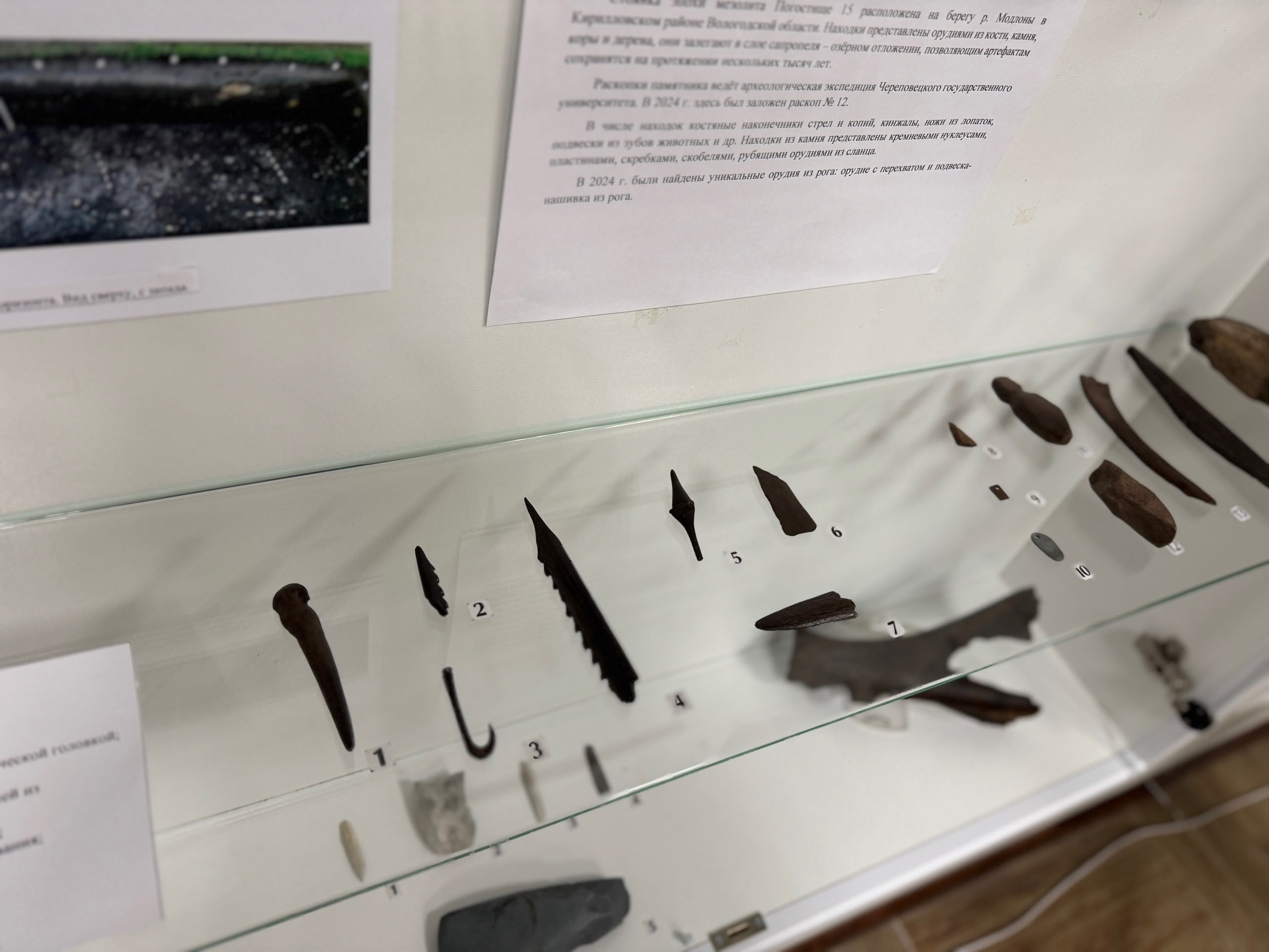 Мезолитическая стоянка «Погостище 15» на берегу реки Модлоны в Кирилловском округе принесла череповецким археологам изделия и орудия из кости, рога, камня и дерева: наконечники стрел и копий, ножи, скребки и рубящие орудия. Есть и уникальные находки из рога, такие как орудие с перехватом и подвеска-нашивка.