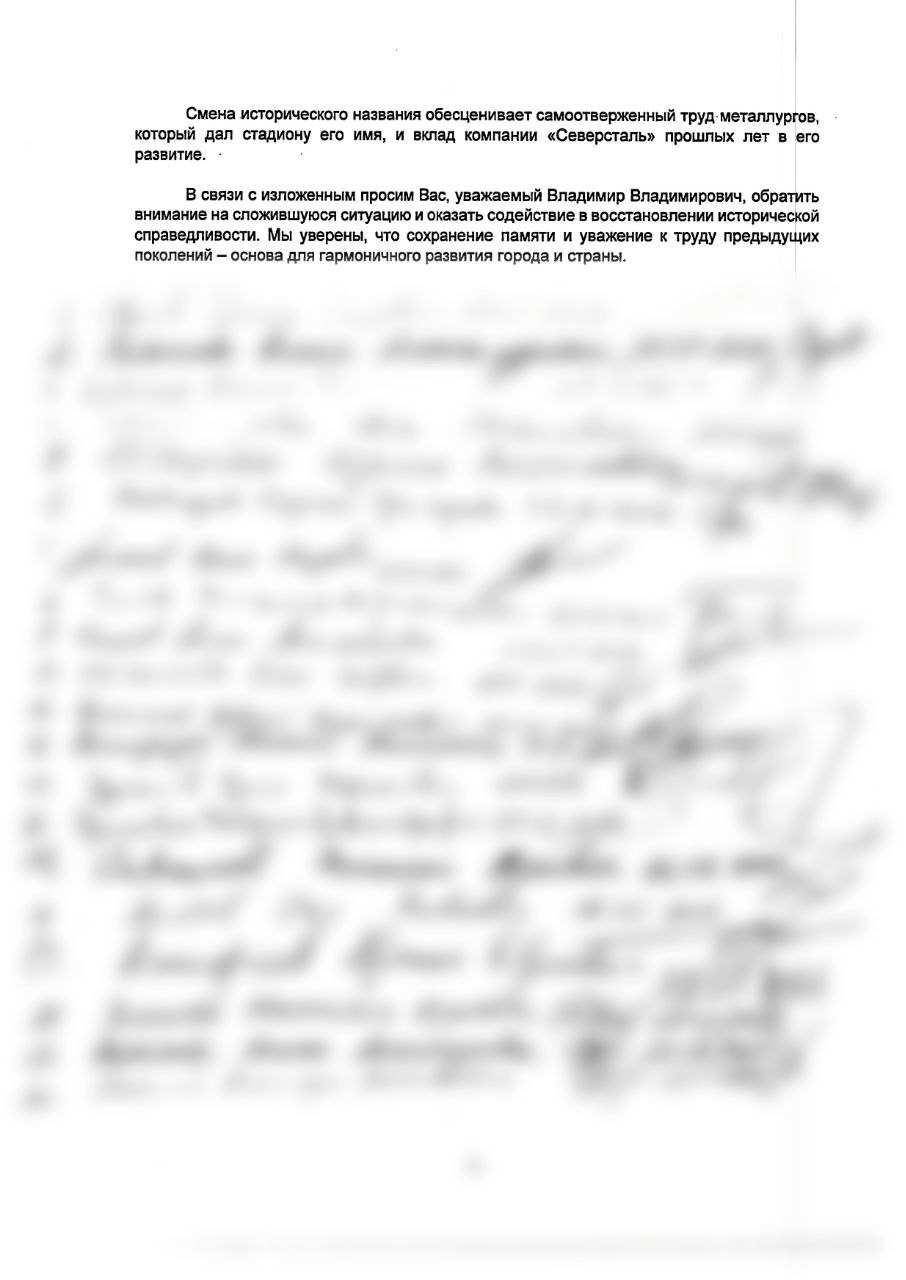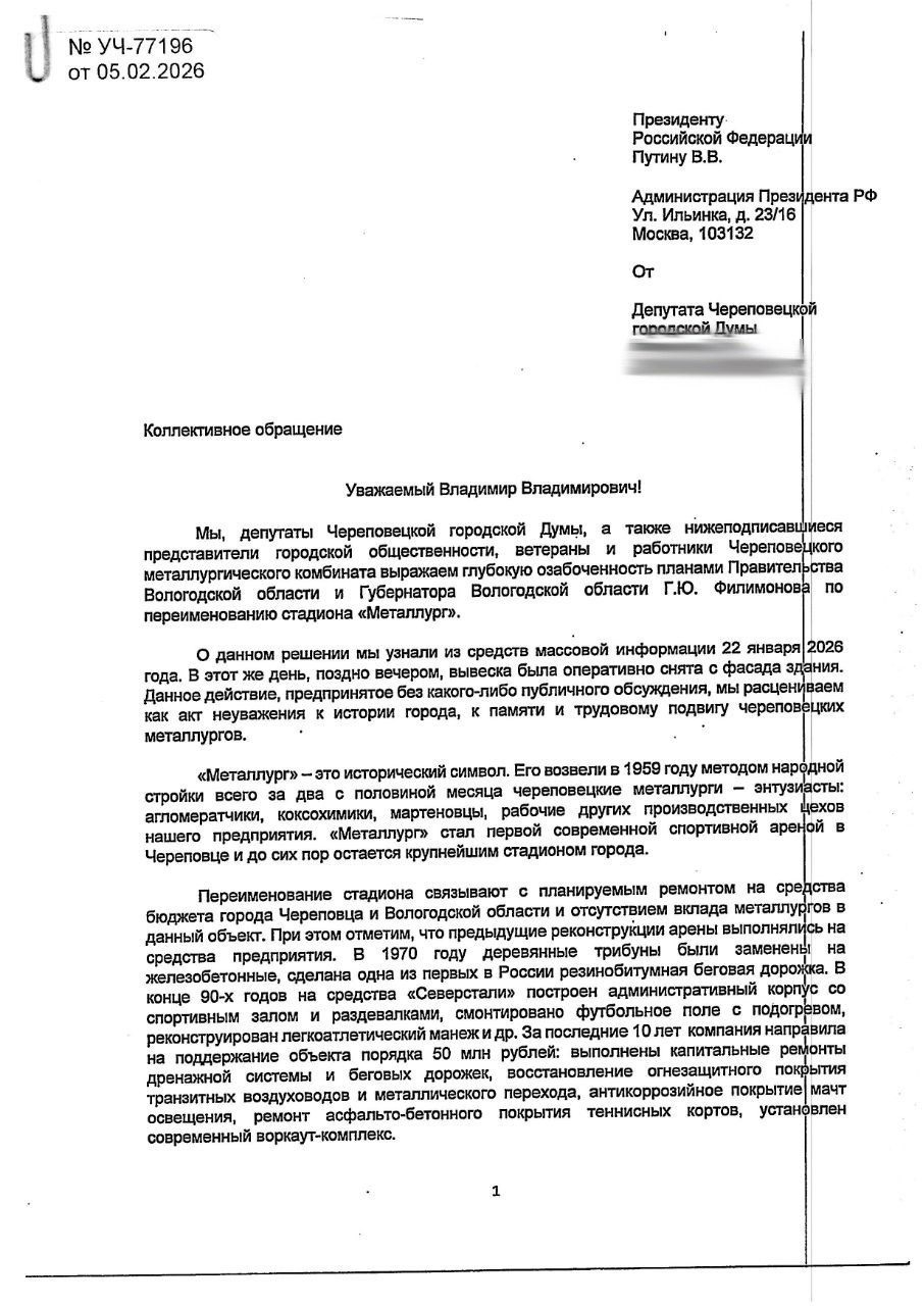 Депутаты Череповецкой городской Думы, представители общественности и ветераны (всего более 9 тысяч человек) подписали письмо на имя главы государства, в котором выразили «глубокую озабоченность планами... губернатора Вологодской области Г.Ю.Филимонова по переименованию стадиона "Металлург"».