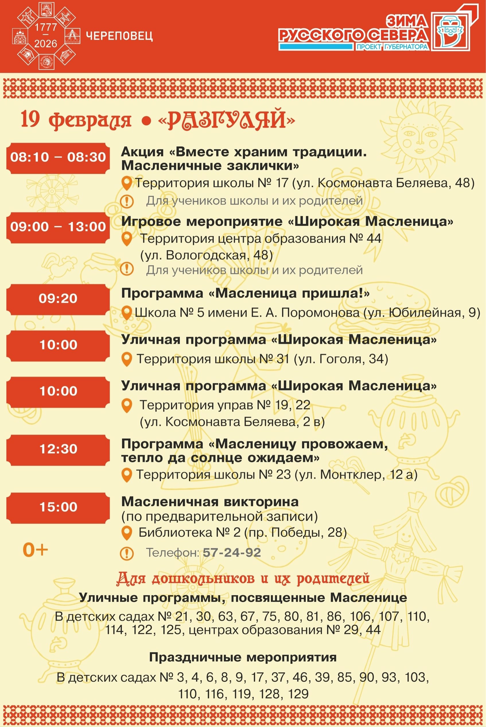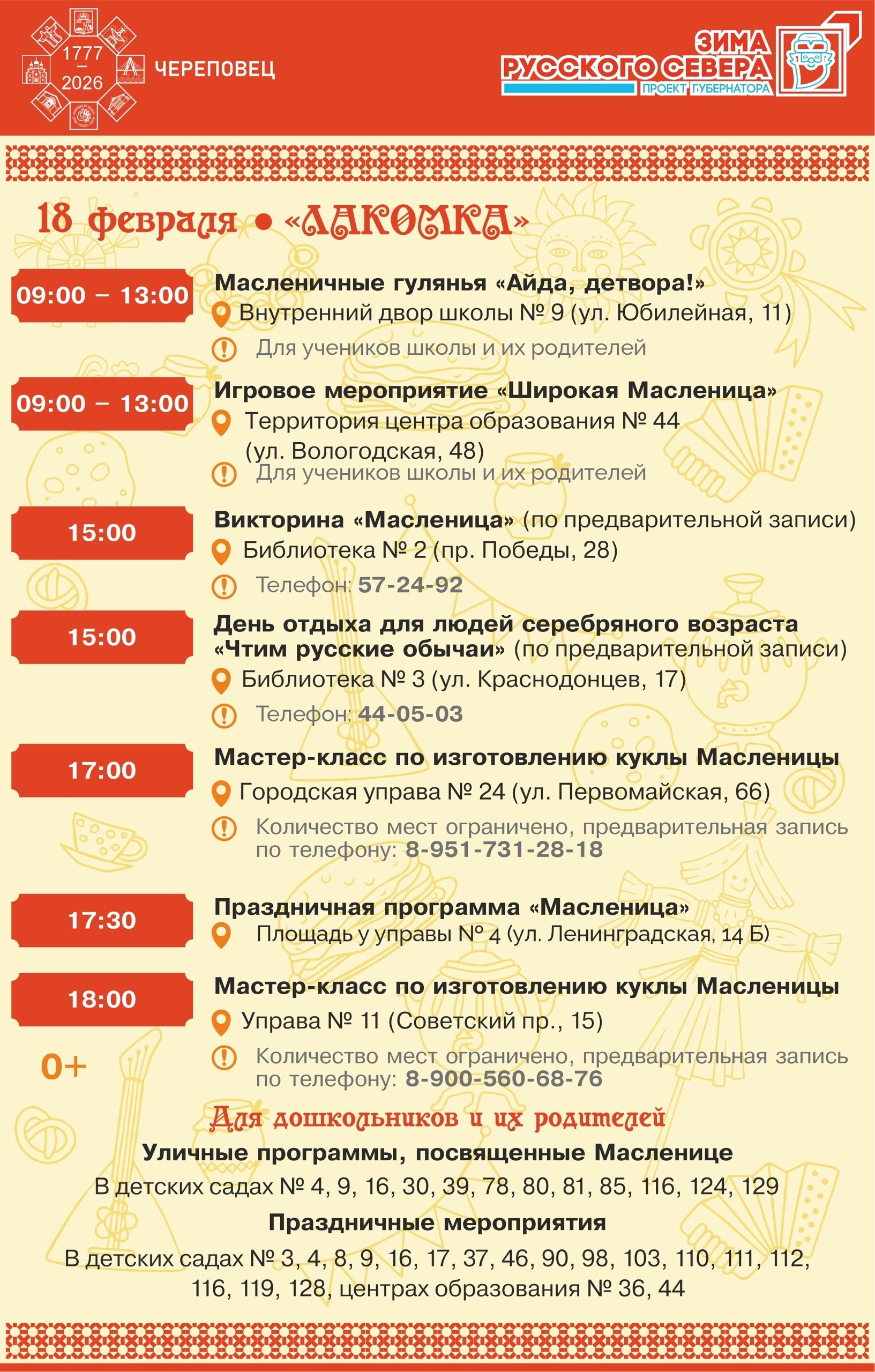 • Среда, 18 февраля — «Лакомка». Вопреки названию, угощаться можно не только блинами, но и сладостями. Масленичные гуляния состоятся на территории управ и во дворах.