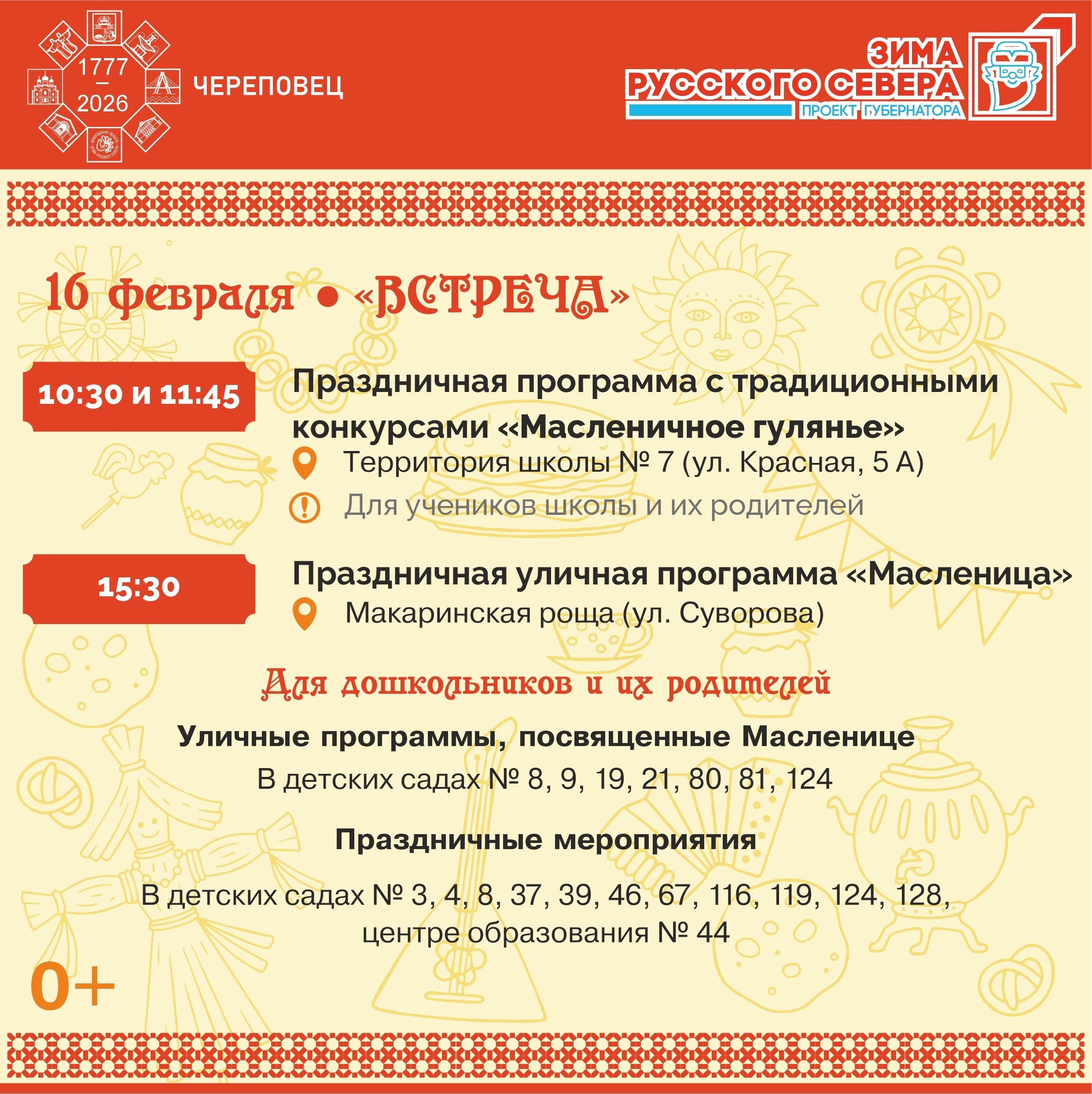 • Понедельник, 16 февраля — «Встреча». Старт недели лучше всего провести с семьей за прогулками и подготовкой к празднику. Праздничная программа запланирована в Макаринской роще и на территории школы №7.