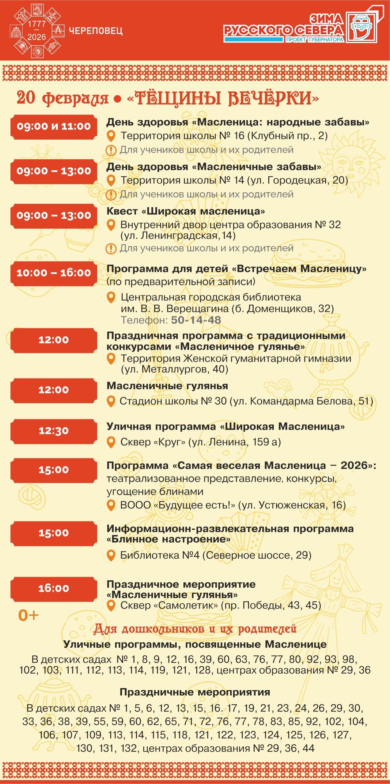 • Пятница, 20 февраля — «Тёщины вечерки». Гуляния во дворах и скверах «Круг» и «Самолётик».