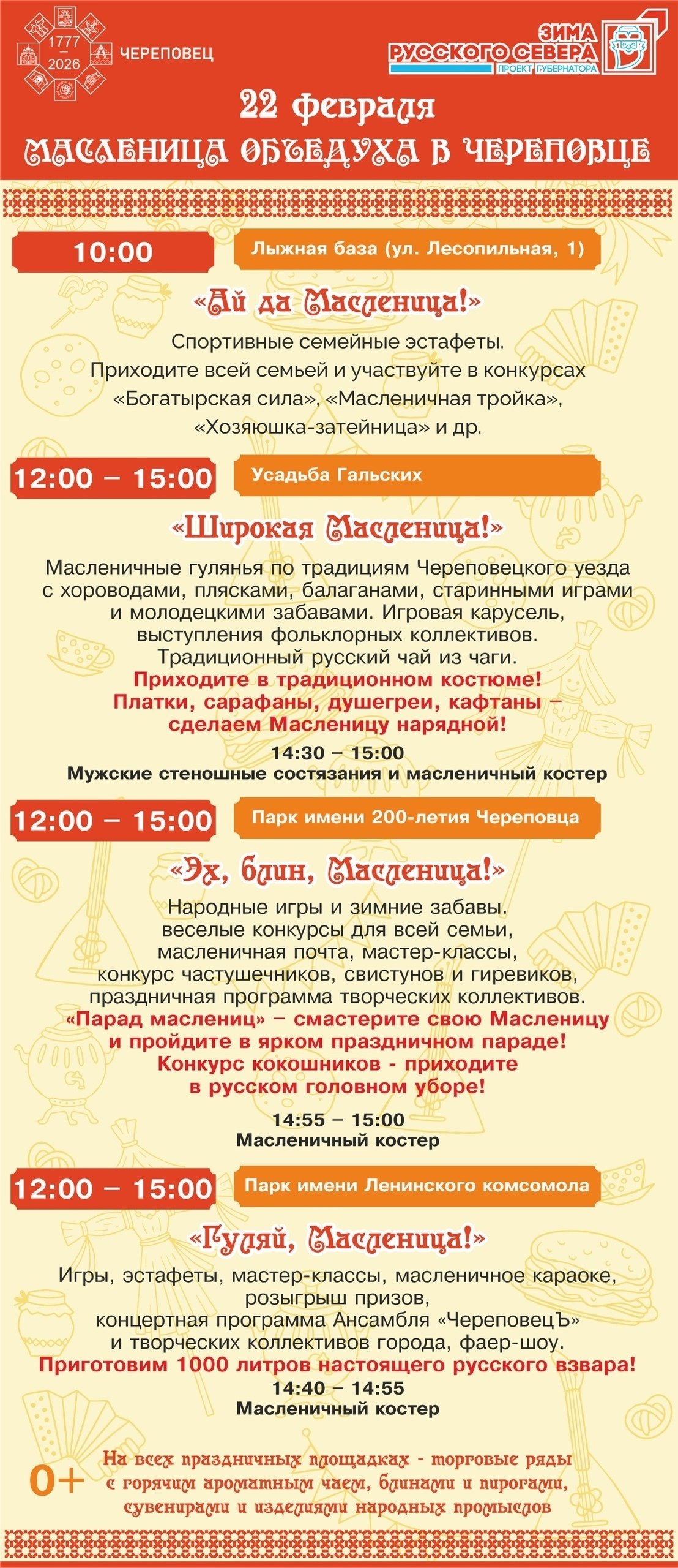 Парк 200-летия Череповца, Комсомольский парк, Лыжная база также подготовили свои программы: конкурсы, забавы, выступления артистов и угощения. Подробная программа на картинках внизу ⬇️.