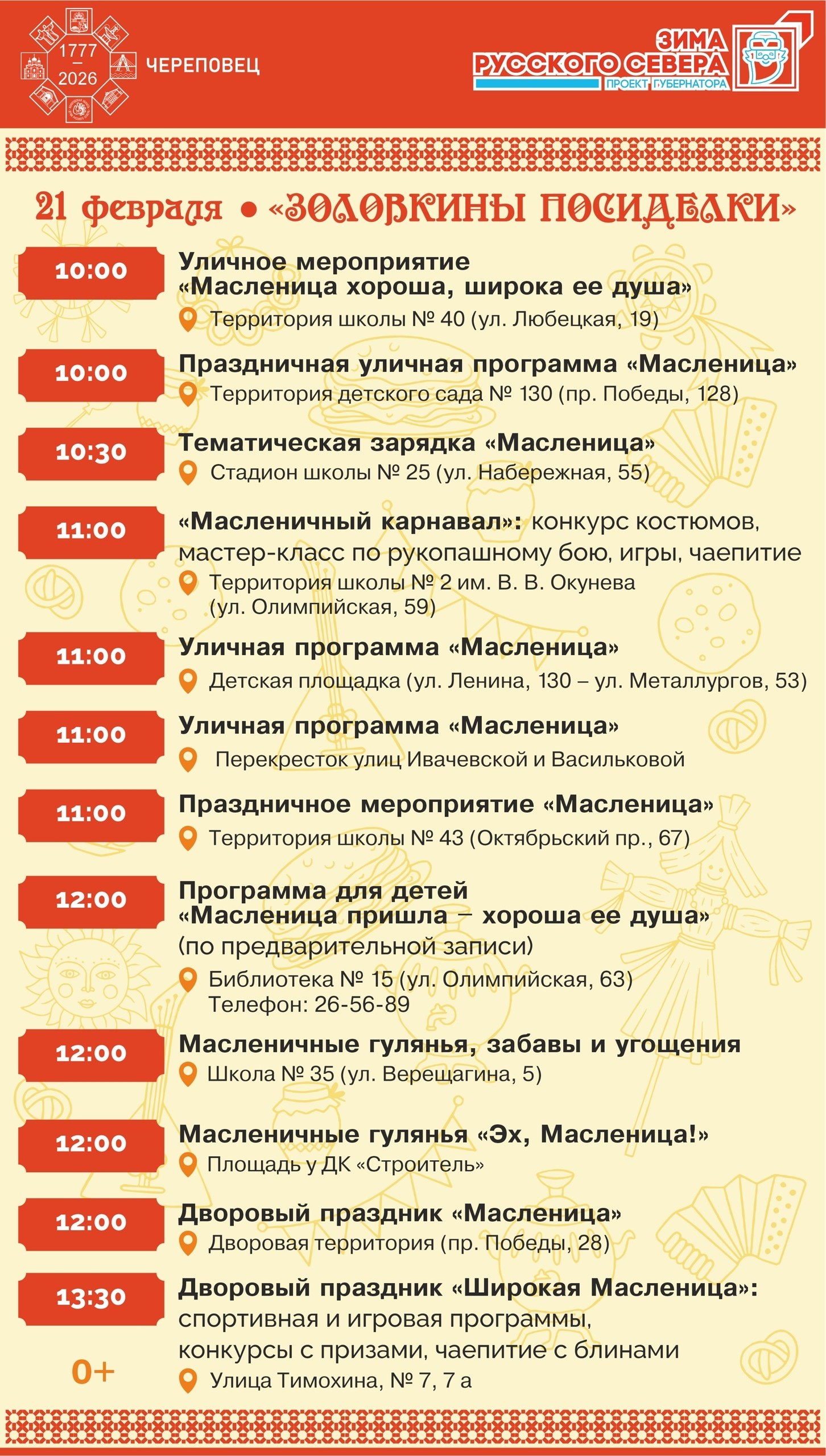 • Воскресенье, 22 февраля — «Прощёное воскресенье» в Череповце назвали «Масленица объедуха». Кульминация праздника с хороводами и сожжением чучела Масленицы.