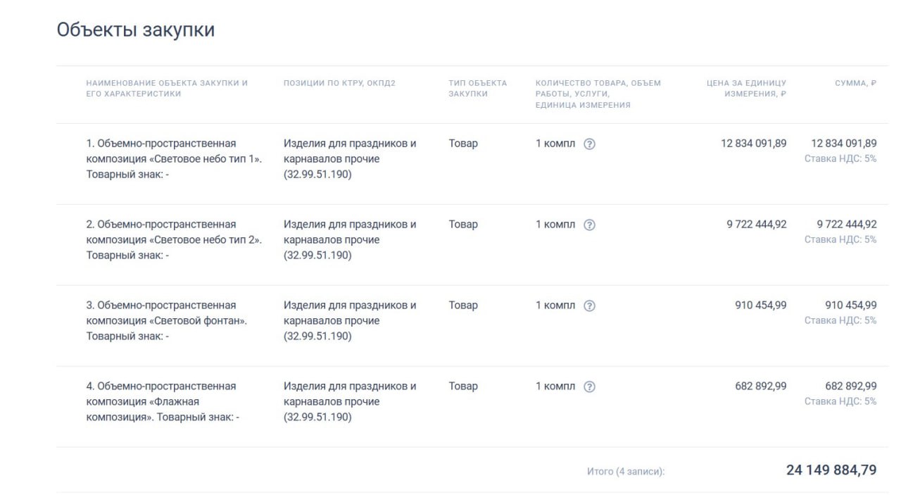 Начальная цена составляла порядка 35 миллионов рублей. По контракту, который заключили с поставщиком, смонтируют все арт-объекты более чем за 24 миллиона.