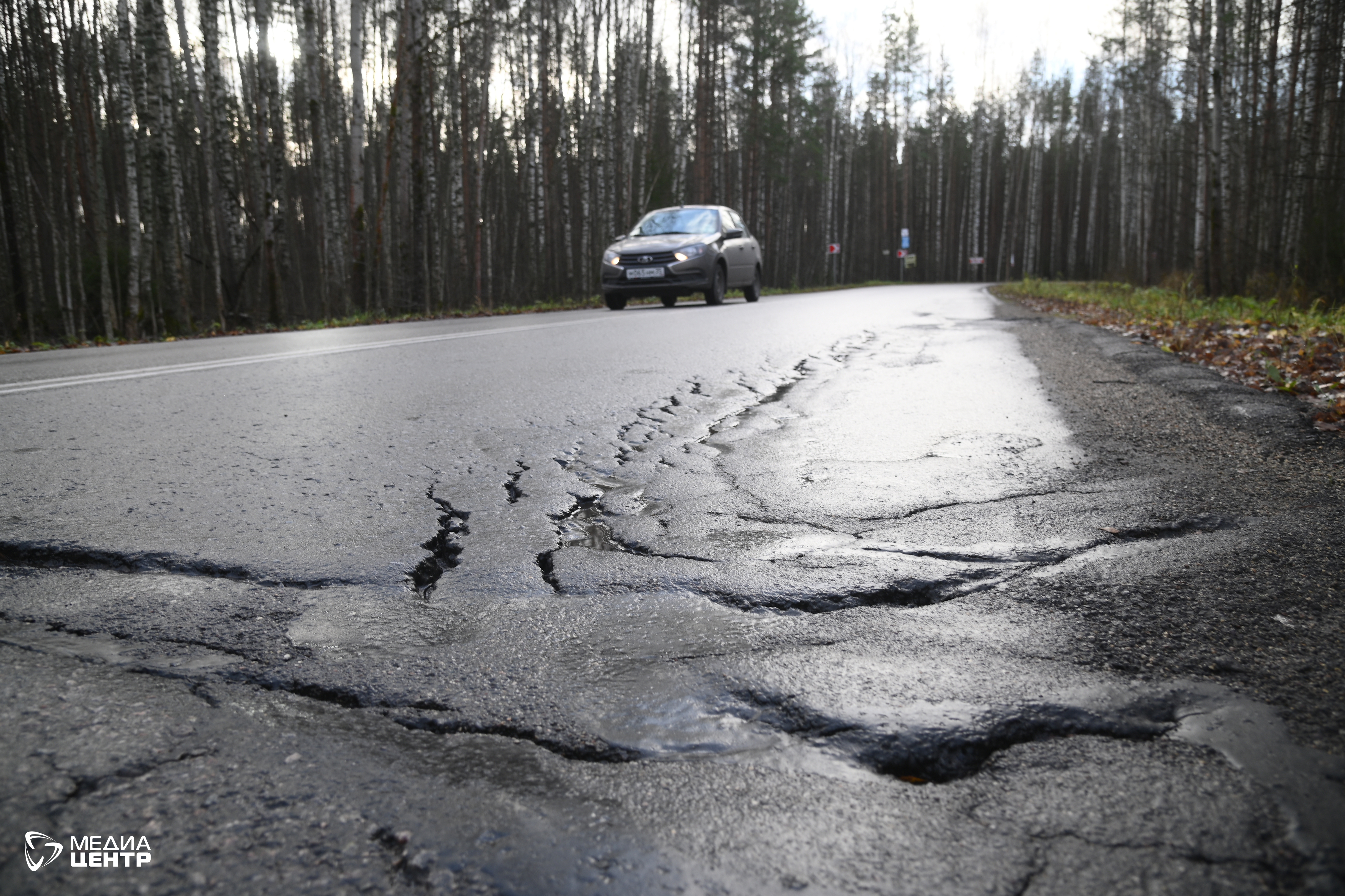 Оказалось, что этот участок дороги ремонтировали не раз. По словам Алексея, почти сразу после капремонта асфальт начал медленно разрушаться: в первую весну по краям дороги появились трещины. Однако больше всего в то время пострадал участок на первом повороте с трассы в сторону деревни. Здесь снег растаял и унес часть покрытия, обнажив старый слой. Тогда подрядчик оперативно устранил замечания.