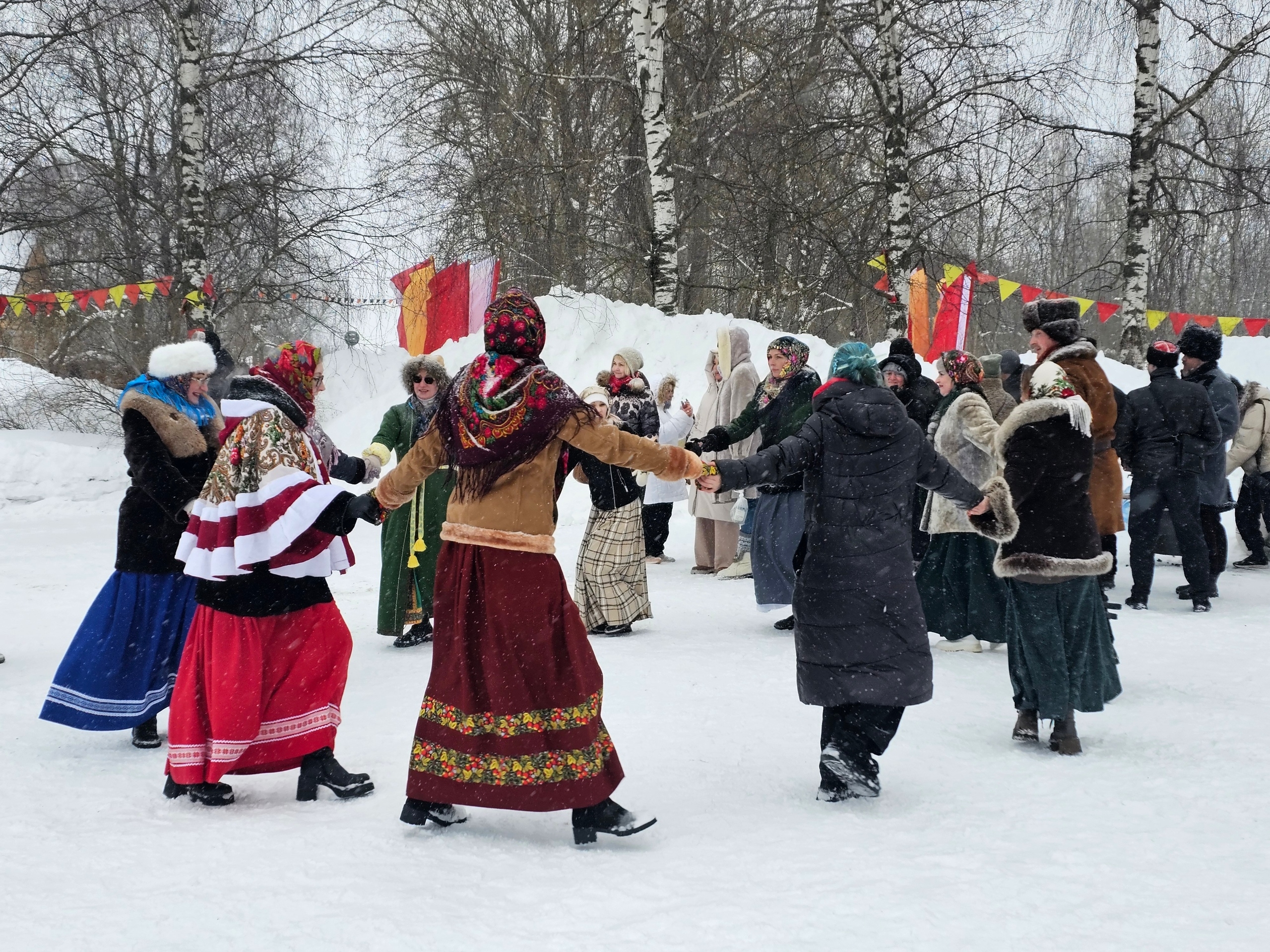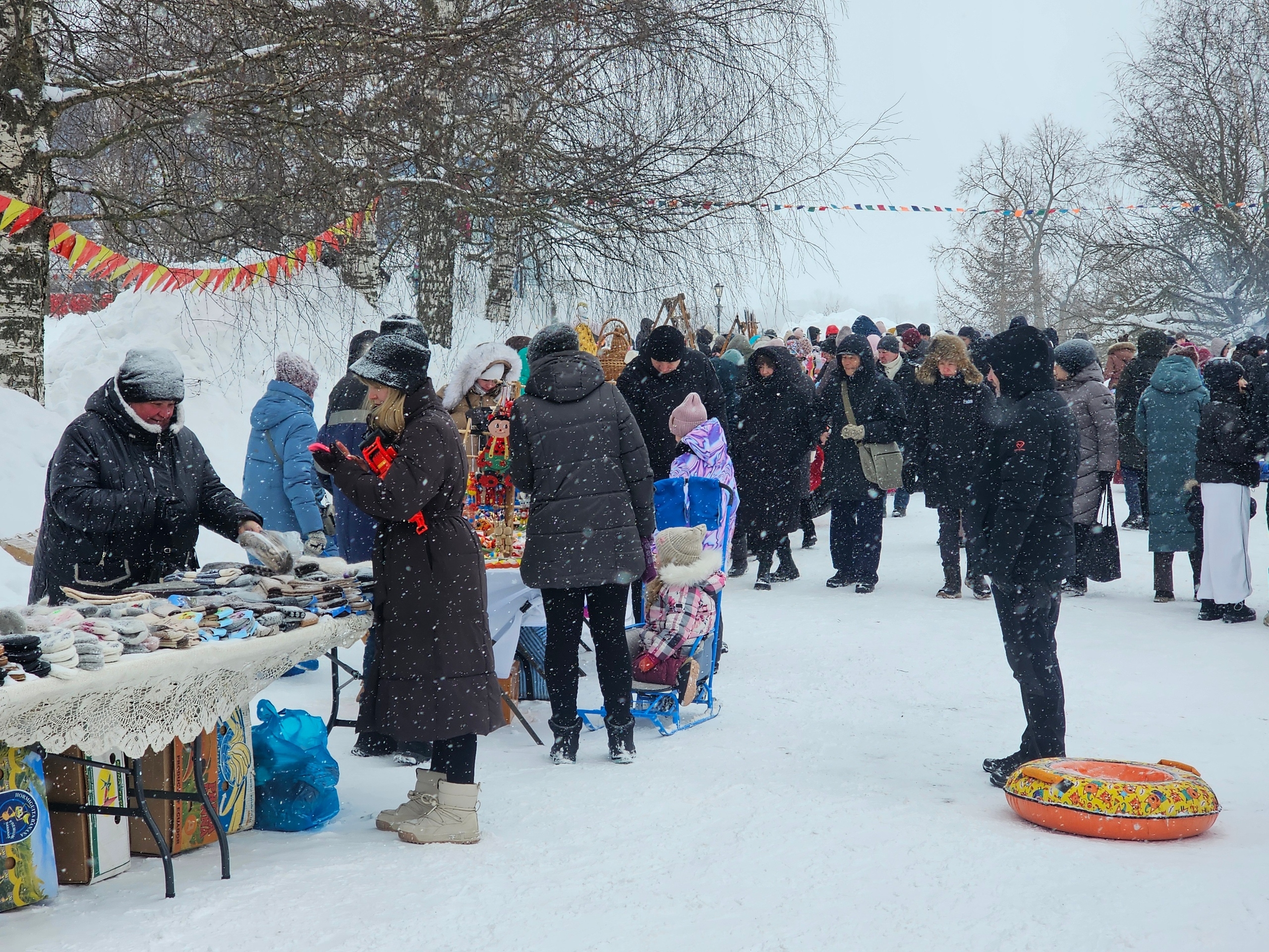На территории работали десятки торговых рядов. Мастерицы продавали валенки, кухонную утварь, пряники, куклы-обереги. Для детей организовали катания на пони и представления кукольного театра. Для взрослых — дегустацию чая из чаги. Особый интерес вызвали мастер-классы по росписи пряников и созданию куклы Масленицы.