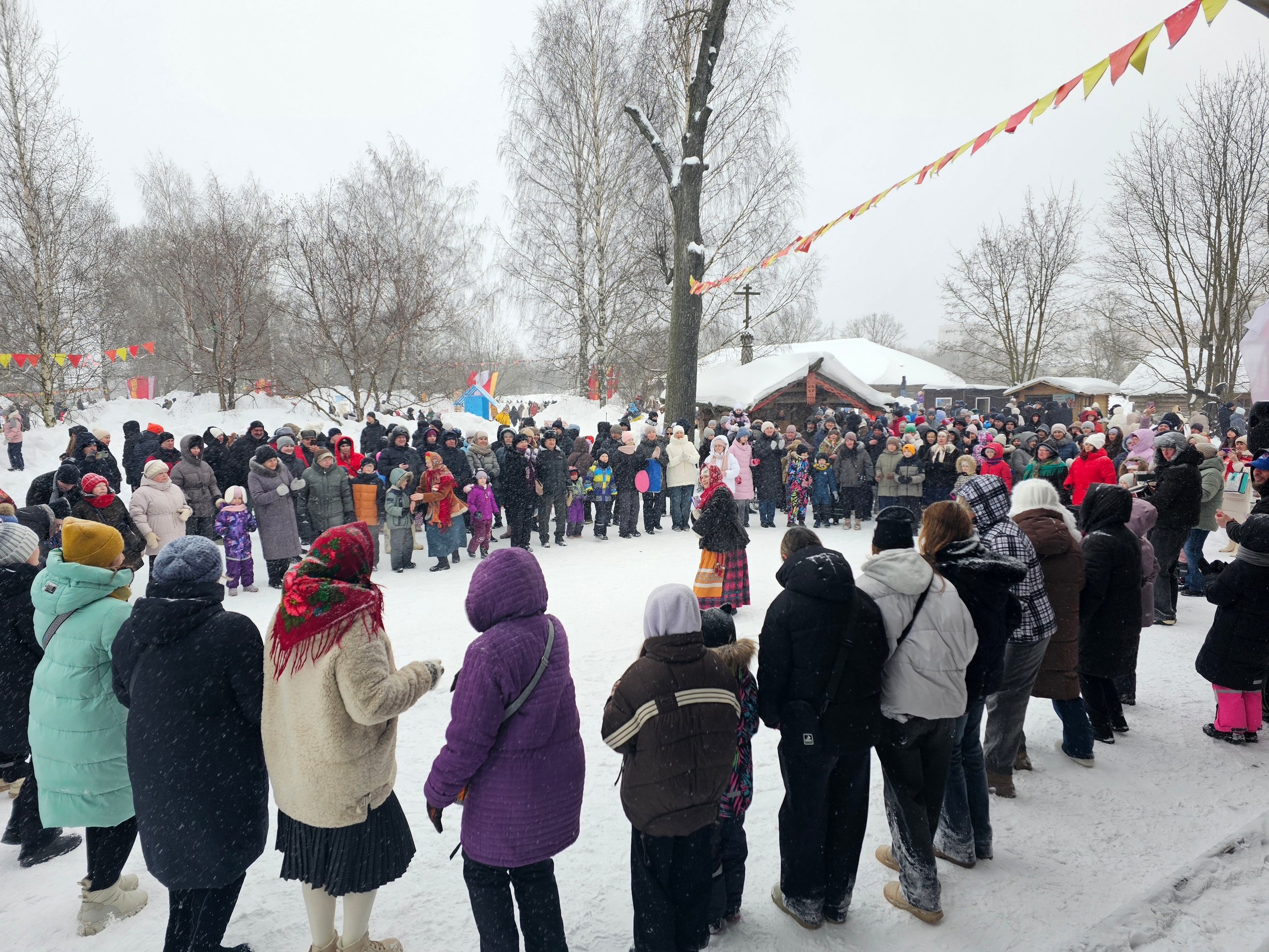 Погода в этот день решила проверить череповчан на прочность. К полудню разыгралась февральская метель. Зима явно не хотела уступать место весне. Но это не остановило любителей народных гуляний. Утром на Лыжной базе для спортивных семей устроили конкурсы и эстафеты. А к полудню основные площадки заполнились людьми.