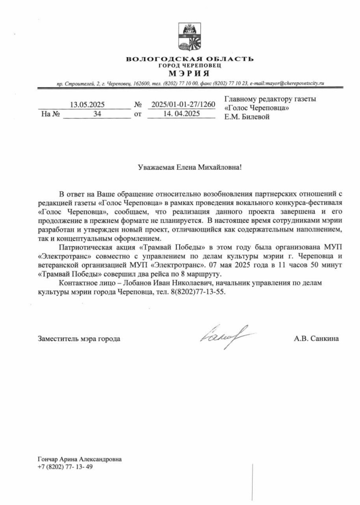 Редакция газеты 14 апреля направила письмо в адрес мэра города Череповца Романа Маслова с просьбой о продолжении партнерских отношений в проведении двух масштабных проектов – фестиваля «Голос Череповца» и акции «Трамвай Победы». Не получив ответа, мы направили запрос в прокуратуру. И сразу же мэрия приняла решение провести акцию «Трамвай Победы», но без «ГЧ» – точно в том формате, как 10 лет назад придумала редакция, но под девизом проекта губернатора Георгия Филимонова «Весна Победы на Русском Севере».