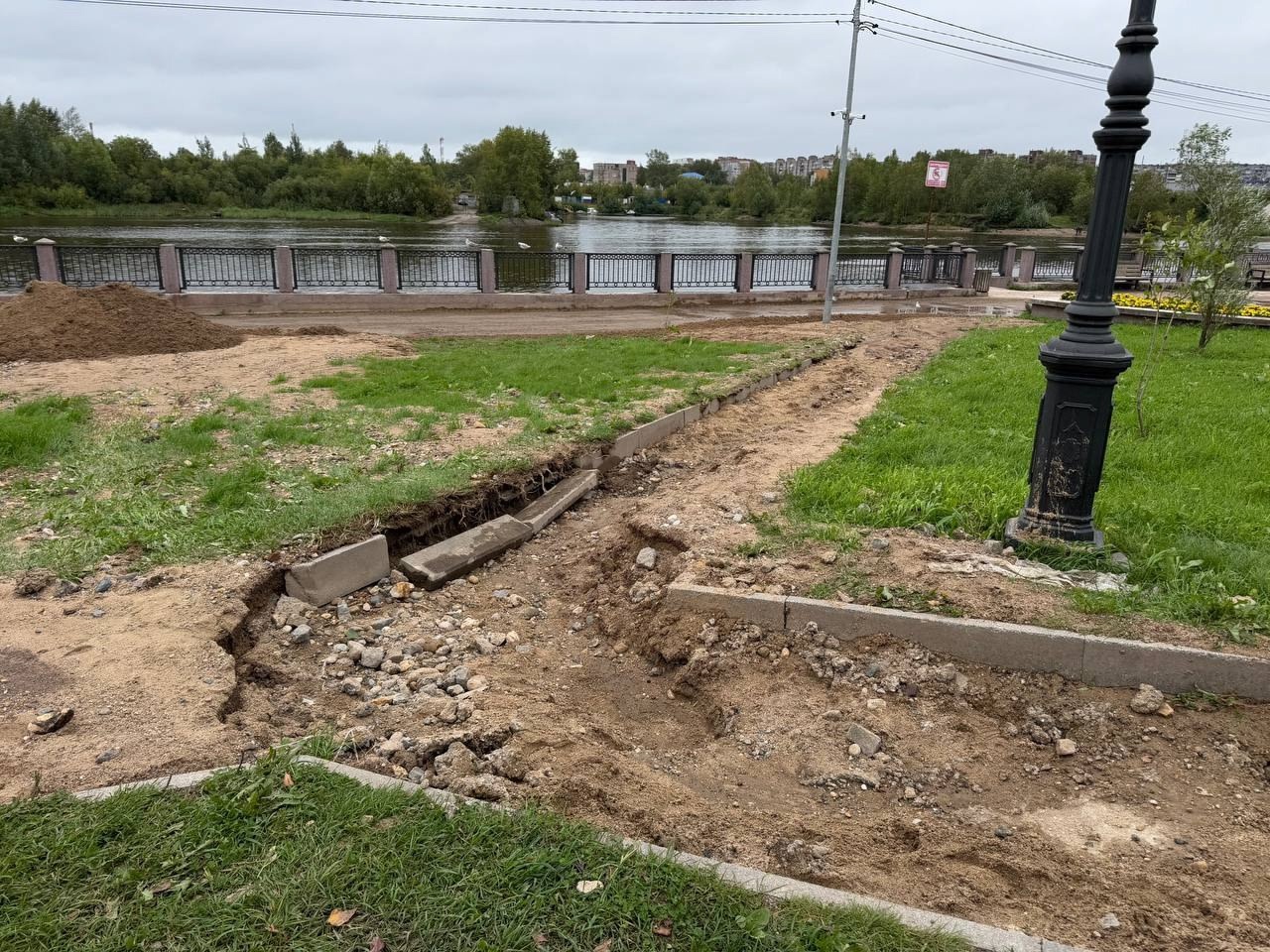 Пострадал от ливня и Северный мост, где частично обвалились тротуар и часть склона. Вчера днем «Череповецдорстрой» начал здесь восстановительные работы.