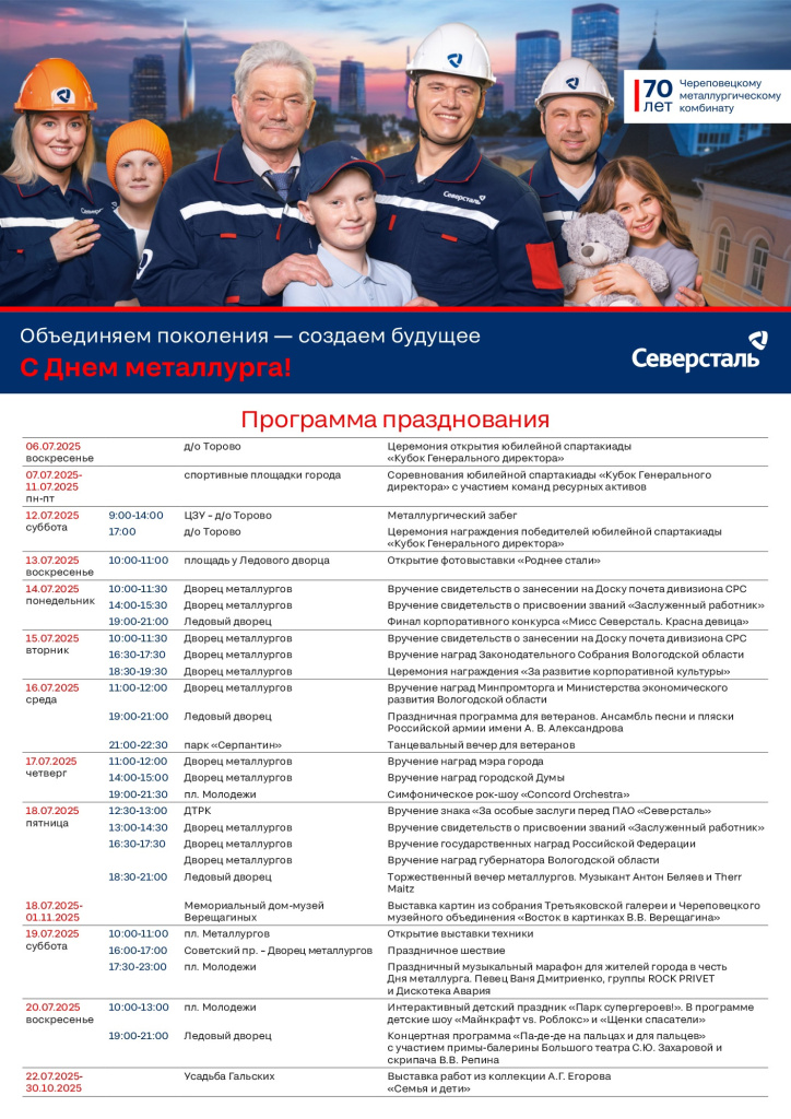 Начнется неделя празднования со спорта. 6 июля стартует первая Юбилейная спартакиада с участием команд из разных городов присутствия компании, также 12 июля пройдет уже ставший традиционным Металлургический забег, в котором ежегодно принимают участие около 1000 человек.