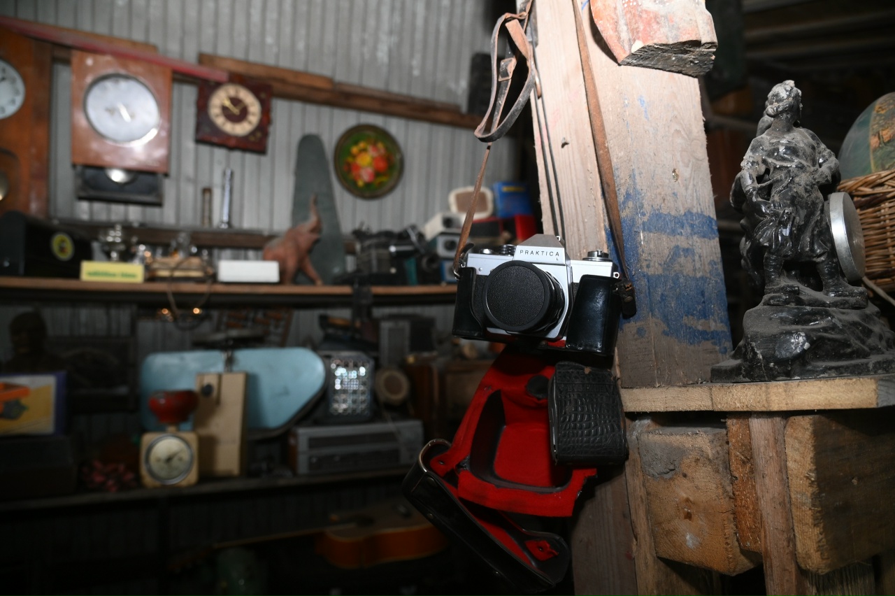 Рядом с ключом — музыкальный инструмент. Это редкая гитара, как говорит Владимир, будто представляет не находку из мусора, а экспонат Лувра. Тут же — японский фотоаппарат 50-х годов.