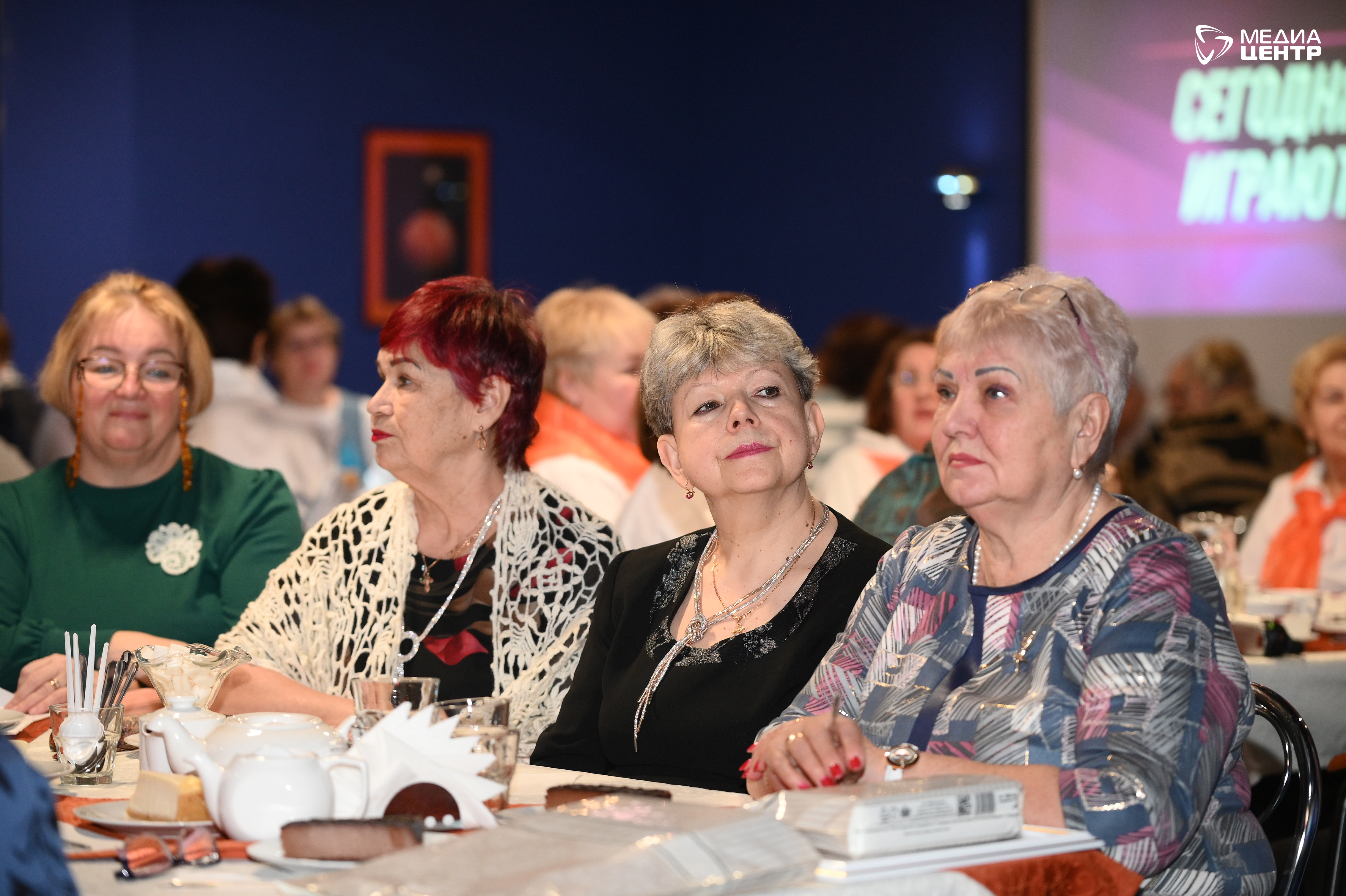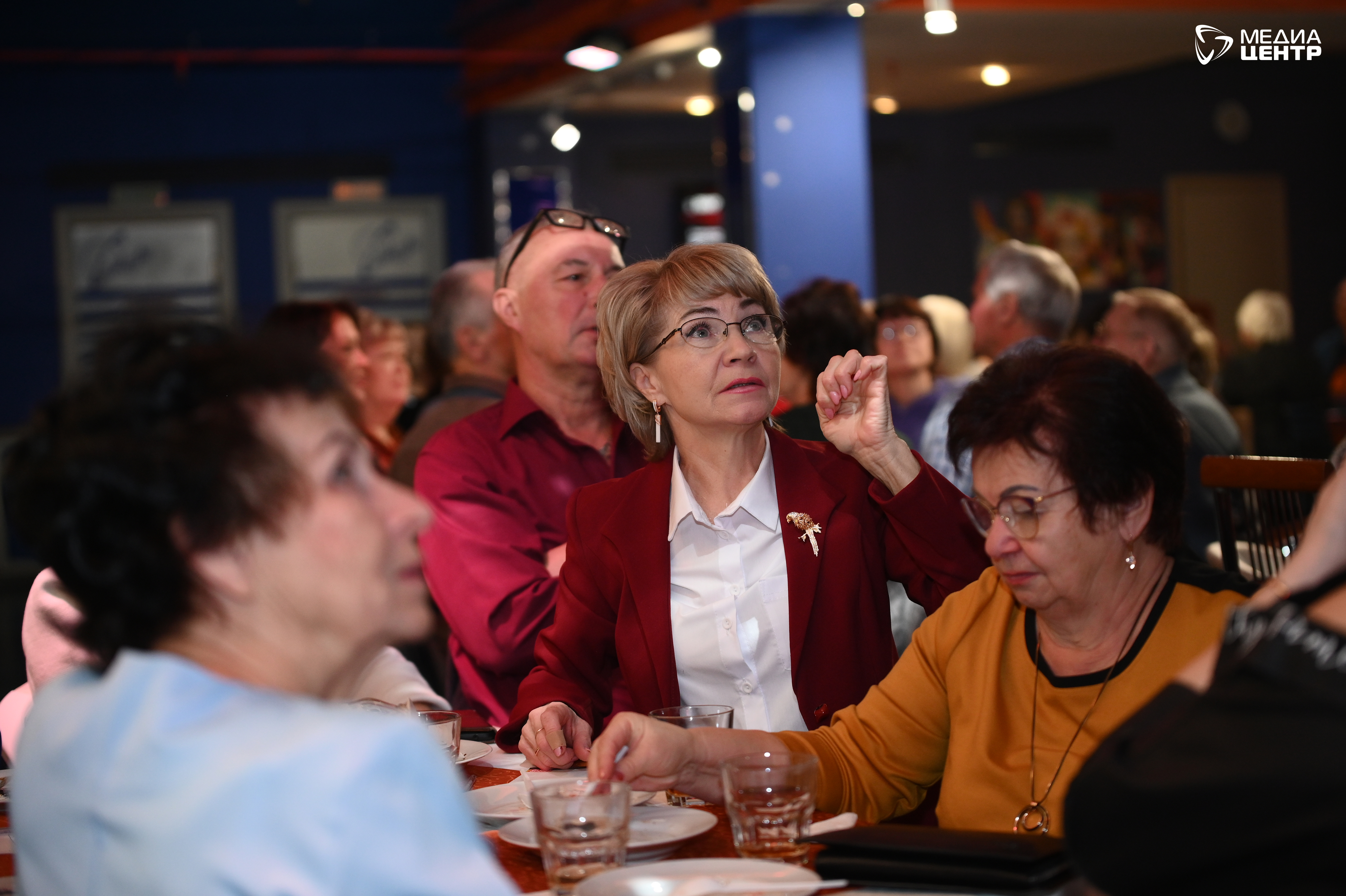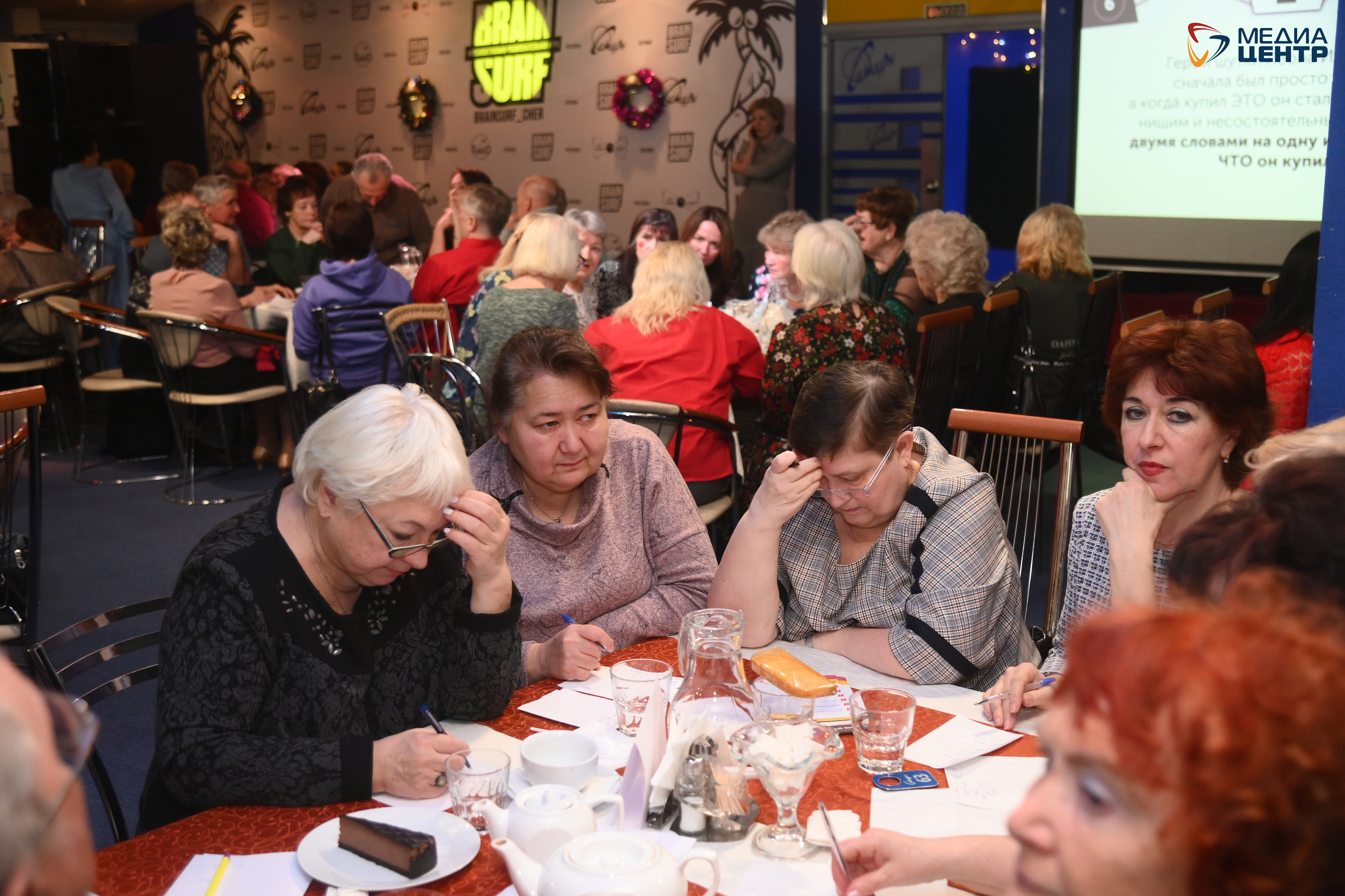 На сцену приглашают Маргариту Гусеву, руководителя Благотворительного фонда «Благо». Маргарита Павловна подчеркивает необычный формат встречи «с мозговой разминкой», говорит о том, что фонд плотно сотрудничает с клубом «Ветеран», и предлагает: «Сегодня — День объятий, давайте обнимем другу друга». Зал бурно поддерживает инициативу, и настроение аудитории становится еще ярче.