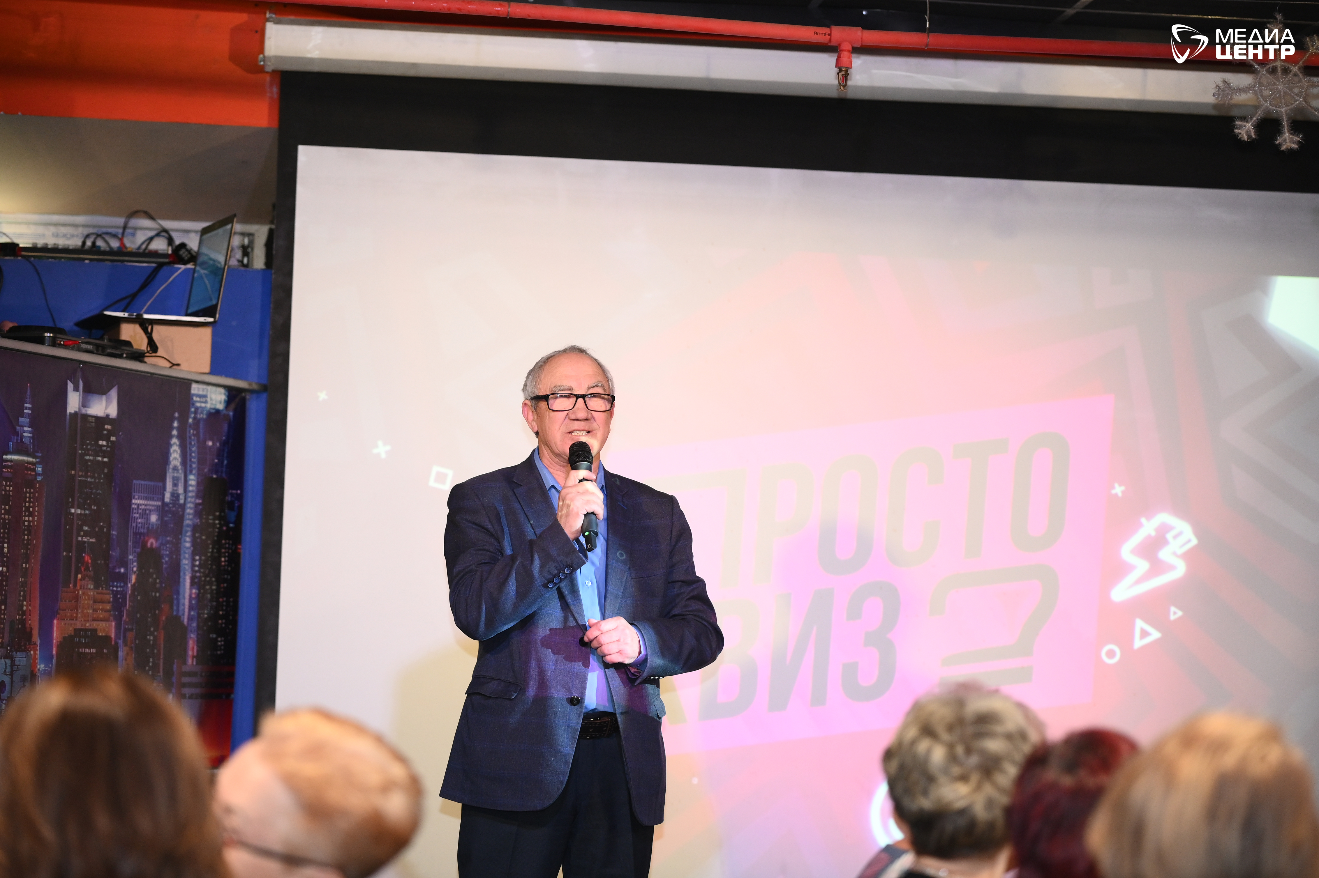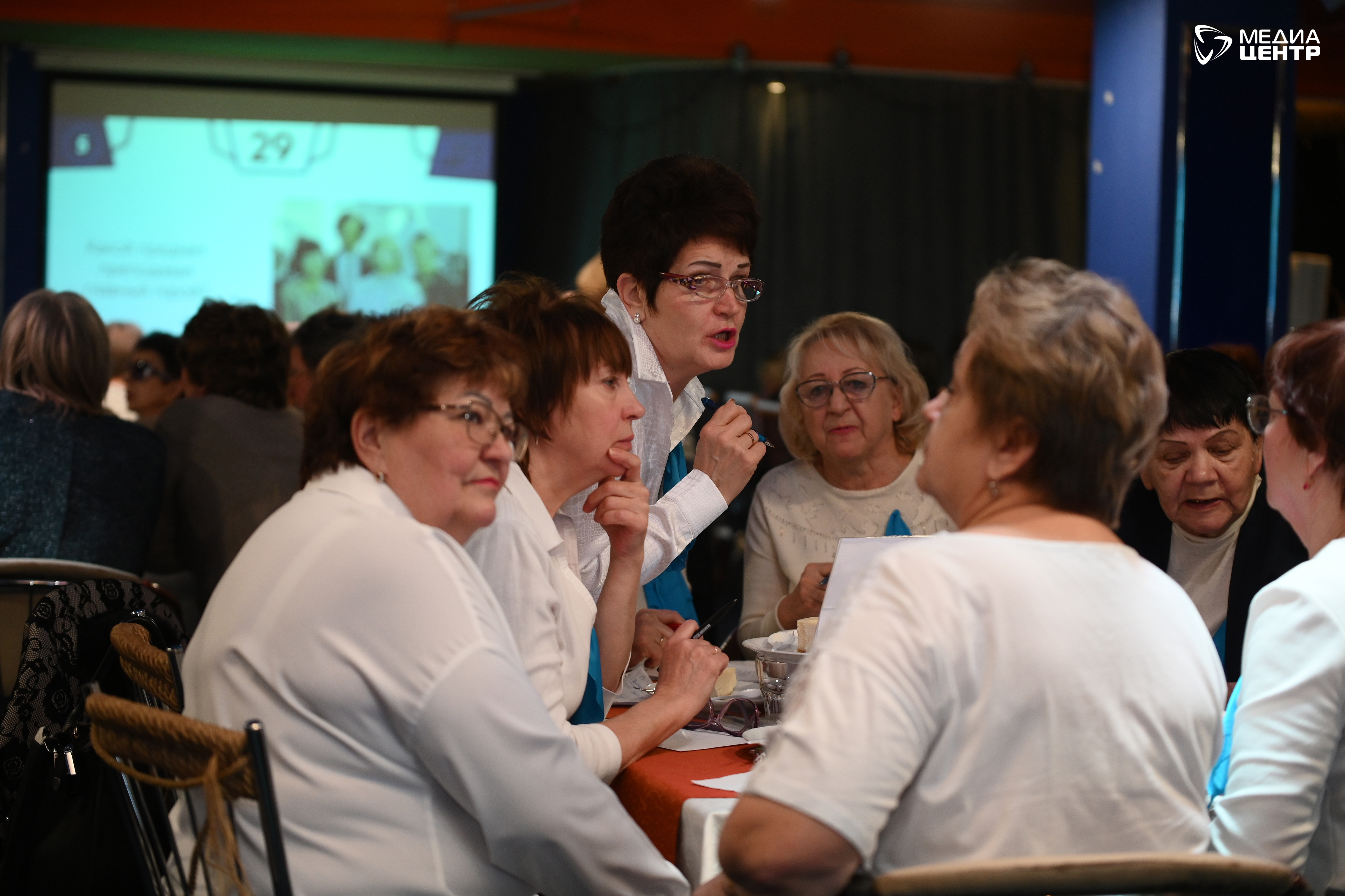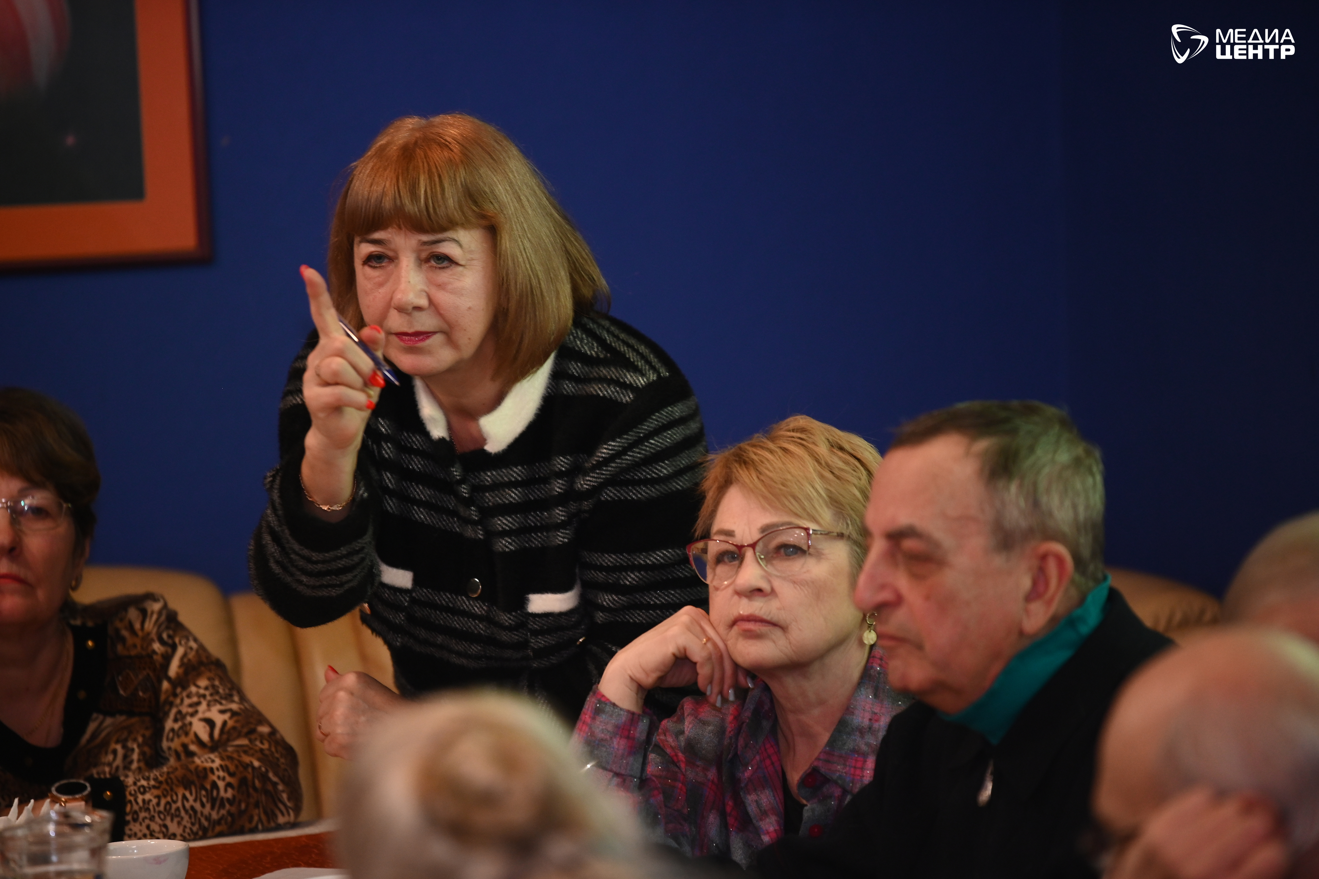 На сцену приглашают Маргариту Гусеву, руководителя Благотворительного фонда «Благо». Маргарита Павловна подчеркивает необычный формат встречи «с мозговой разминкой», говорит о том, что фонд плотно сотрудничает с клубом «Ветеран», и предлагает: «Сегодня — День объятий, давайте обнимем другу друга». Зал бурно поддерживает инициативу, и настроение аудитории становится еще ярче.