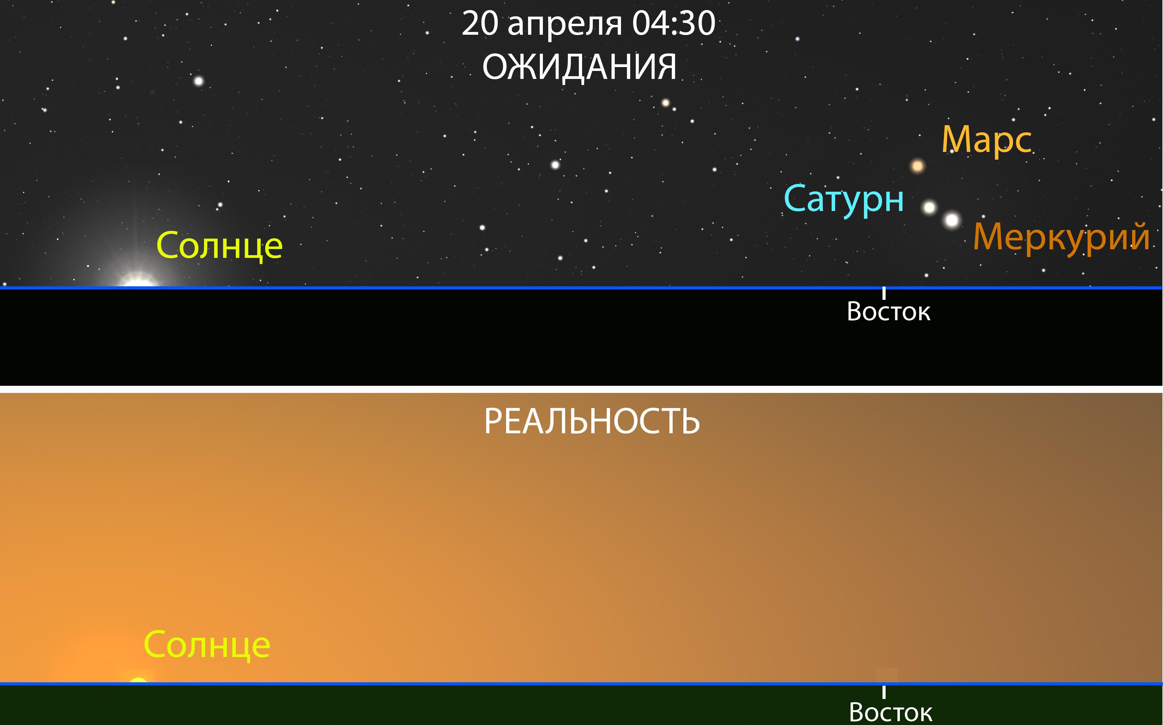 Планеты появятся из-за горизонта рано утром — вместе с Солнцем — и будут проецироваться на дневное небо, которое полностью их «засветит». Максимальное сближение планет произойдёт не в субботу, как пишут многие, а утром в понедельник и вторник (20 и 21 апреля). Явление действительно редкое и красивое, но, увы, российским наблюдателям оно недоступно.