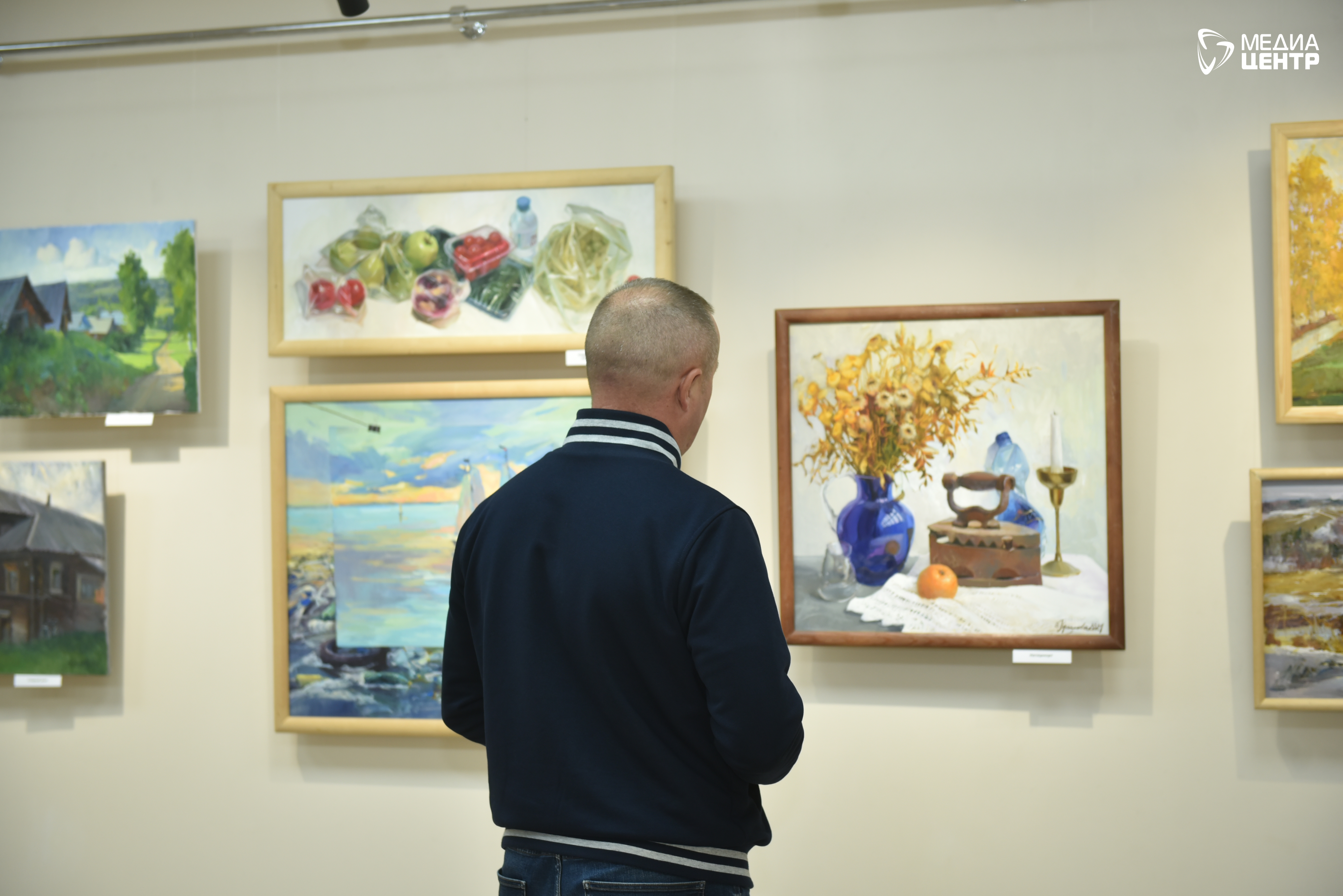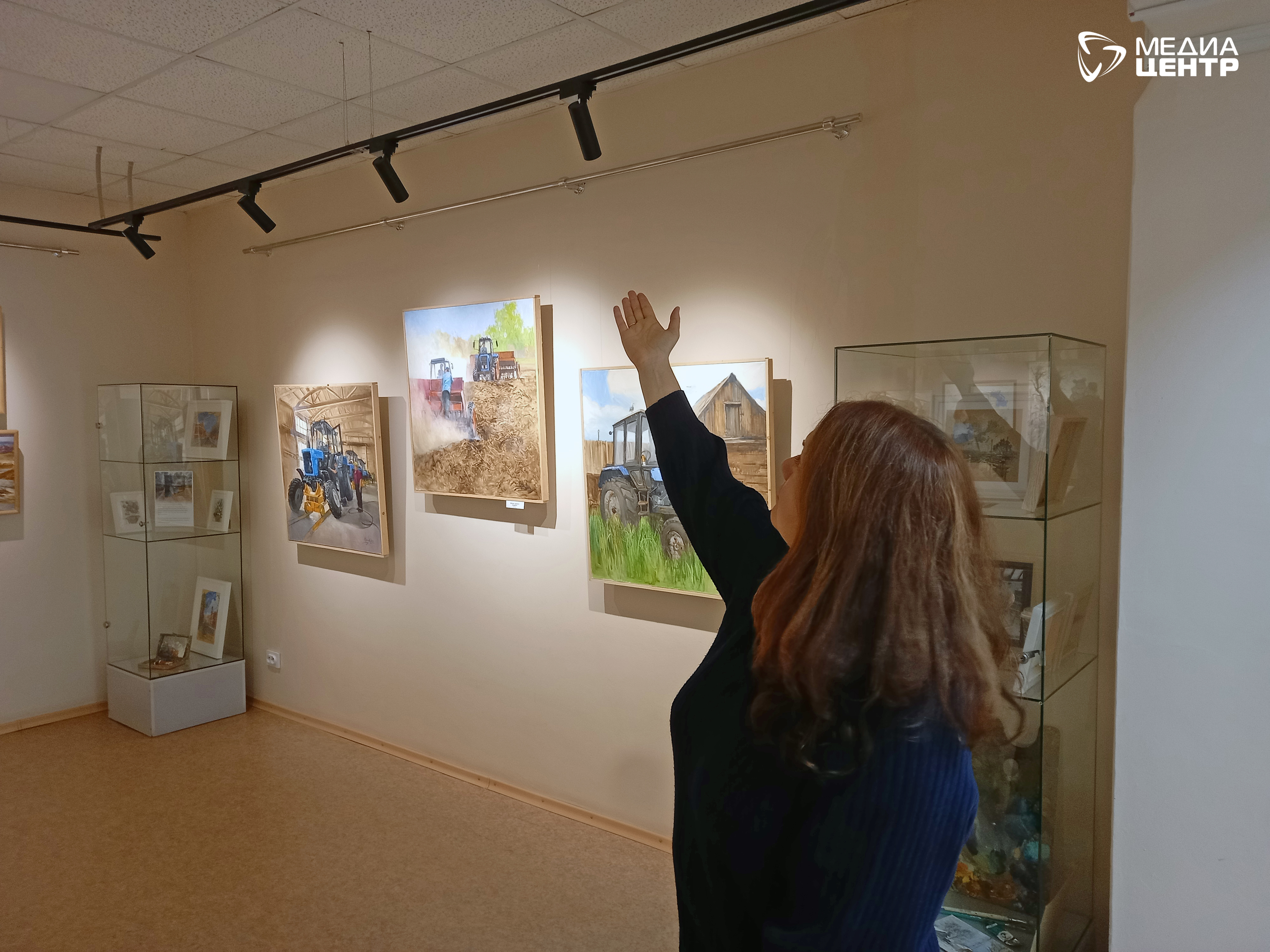 Мы проходим в помещение для экспозиций. Здесь как раз выставка картин Екатерины Крыловой. Наша собеседница не без удовольствия демонстрирует подсветку картин, которые, кажется, ярче заиграли красками, выгодно подчеркивая мастерство художника. Обращаем внимание на натюрморт. Заведующая библиотекой поясняет: картина посвящена проблемам экологии. На ней изображены вечные вещи. Чугунный утюг, в который засыпались горячие угли, — такими пользовались наши прабабушки. Латунный подсвечник, кувшин из синего стекла, а на заднем плане — мятая пластиковая бутылка. Так она ведь выбивается из ряда!