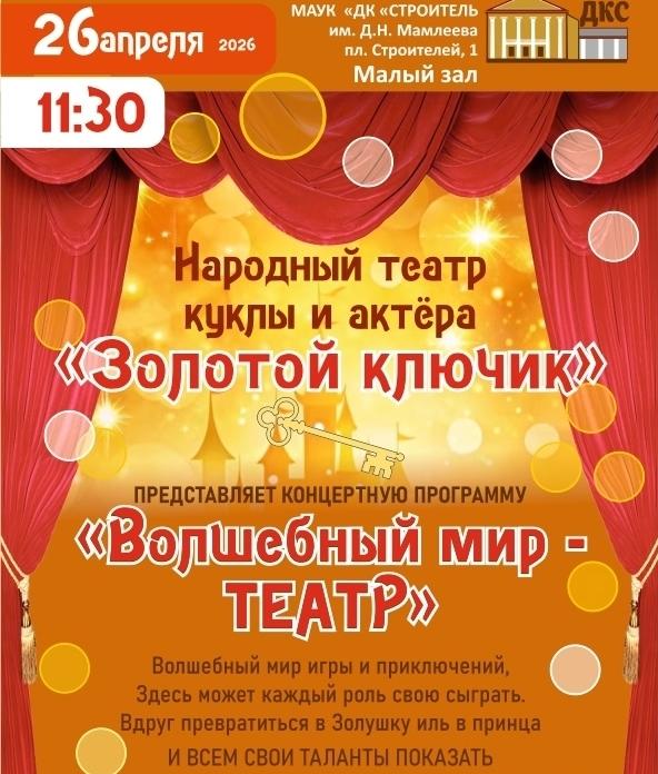 11:30 – Народный театр куклы и актёра «Золотой ключик» приглашает на концертную программу «Волшебный мир – Театр» (0+) в ДК «Строитель» (малый зал).