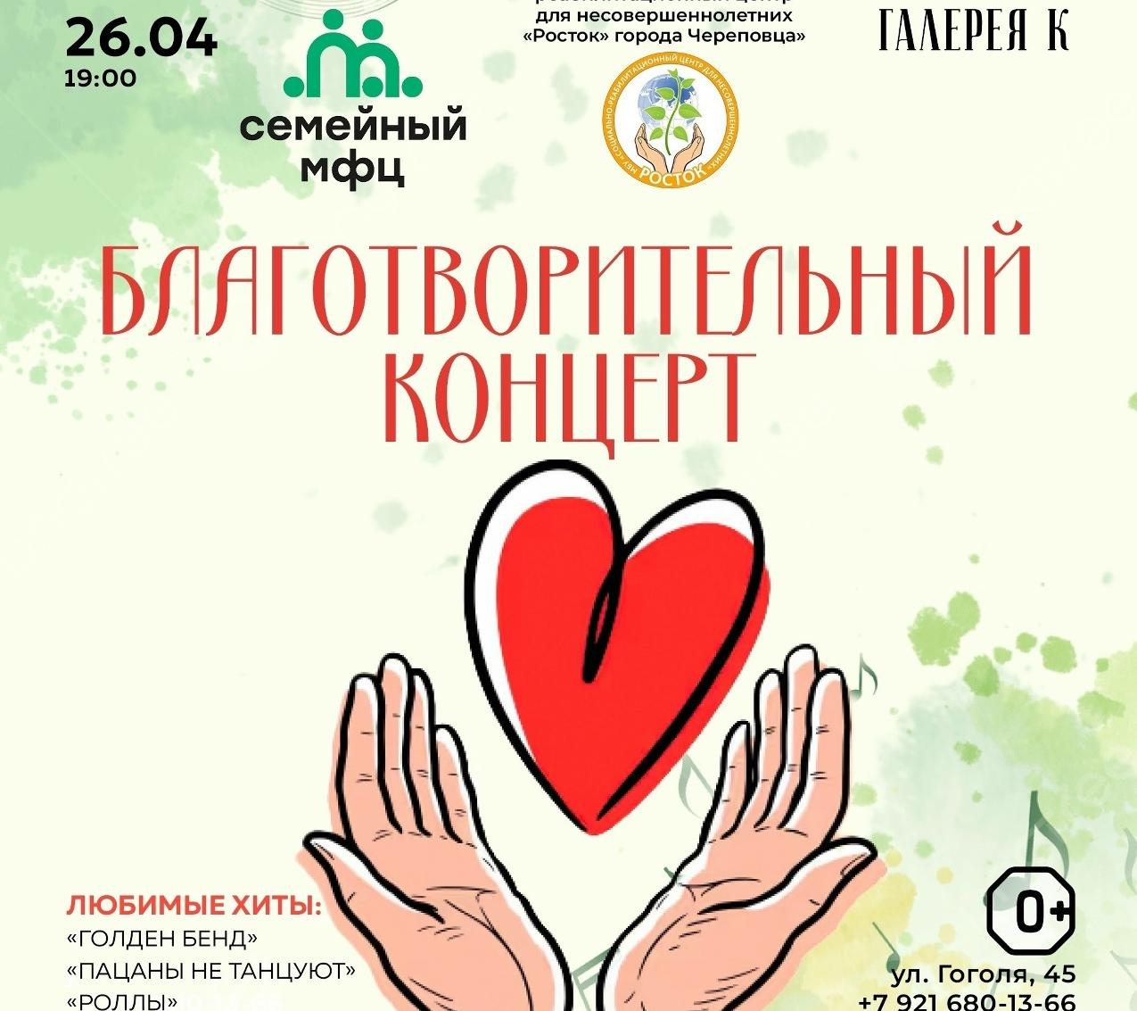 19:00 – благотворительный концерт (0+) в поддержку семейного МФЦ в арт-кластере «Завод» («Галерея К»). Выступят кавер-группа Golden Band, «Пацаны не танцуют», кавер-группа «Роллы Череповец».