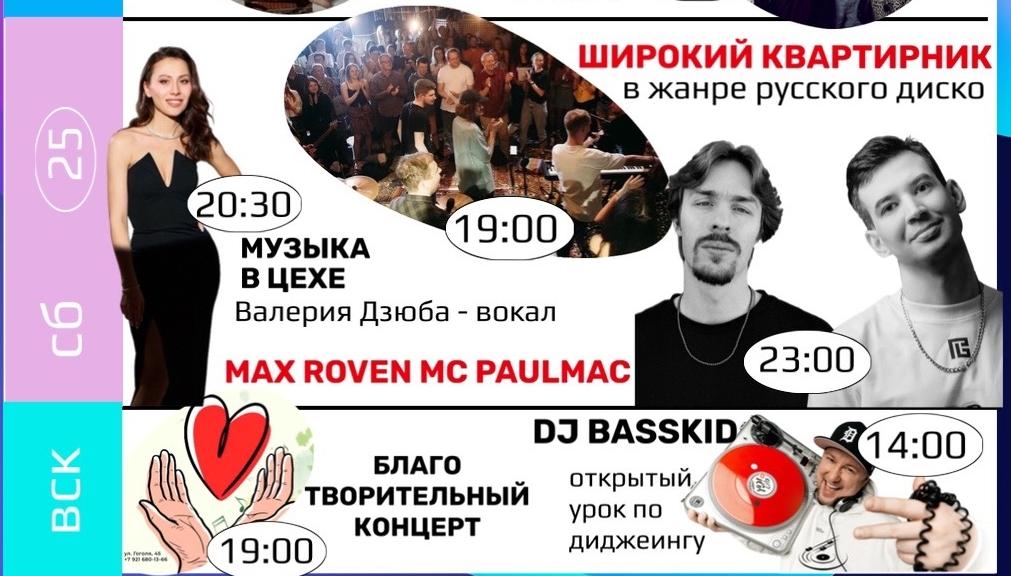 19:30 – в арт-кластере «Завод» «Широкий квартирник» (16+) в жанре русского диско; в 20:30 – вечер живой музыки. Валерия Дзюба – вокал. 23:00 – резиденты радио Record Max Roven & MC Polumak.