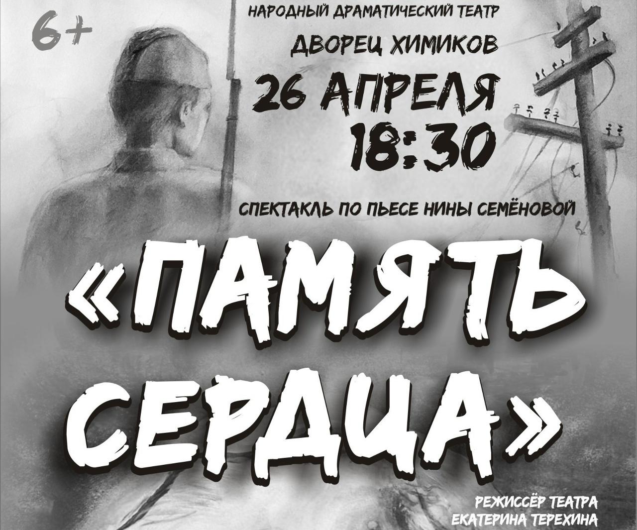 18:30 - на сцене Дворца химиков «Память сердца» (6+) - спектакль по пьесе Нины Семёновой.
