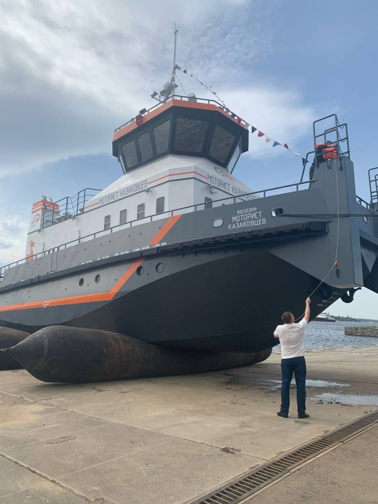 На Череповецком судостроительном заводе спустили новый буксир «Моторист Казаковцев». Это третье судно серии буксиров проекта ТСК.395М, которое предприятие строит при поддержке Фонда национального благосостояния. Буксир мощностью 1300 лошадиных сил способен тянуть более восьми барж одновременно. Подъёмная рубка улучшает обзор и повышает безопасность, особенно при проводке длинных составов.