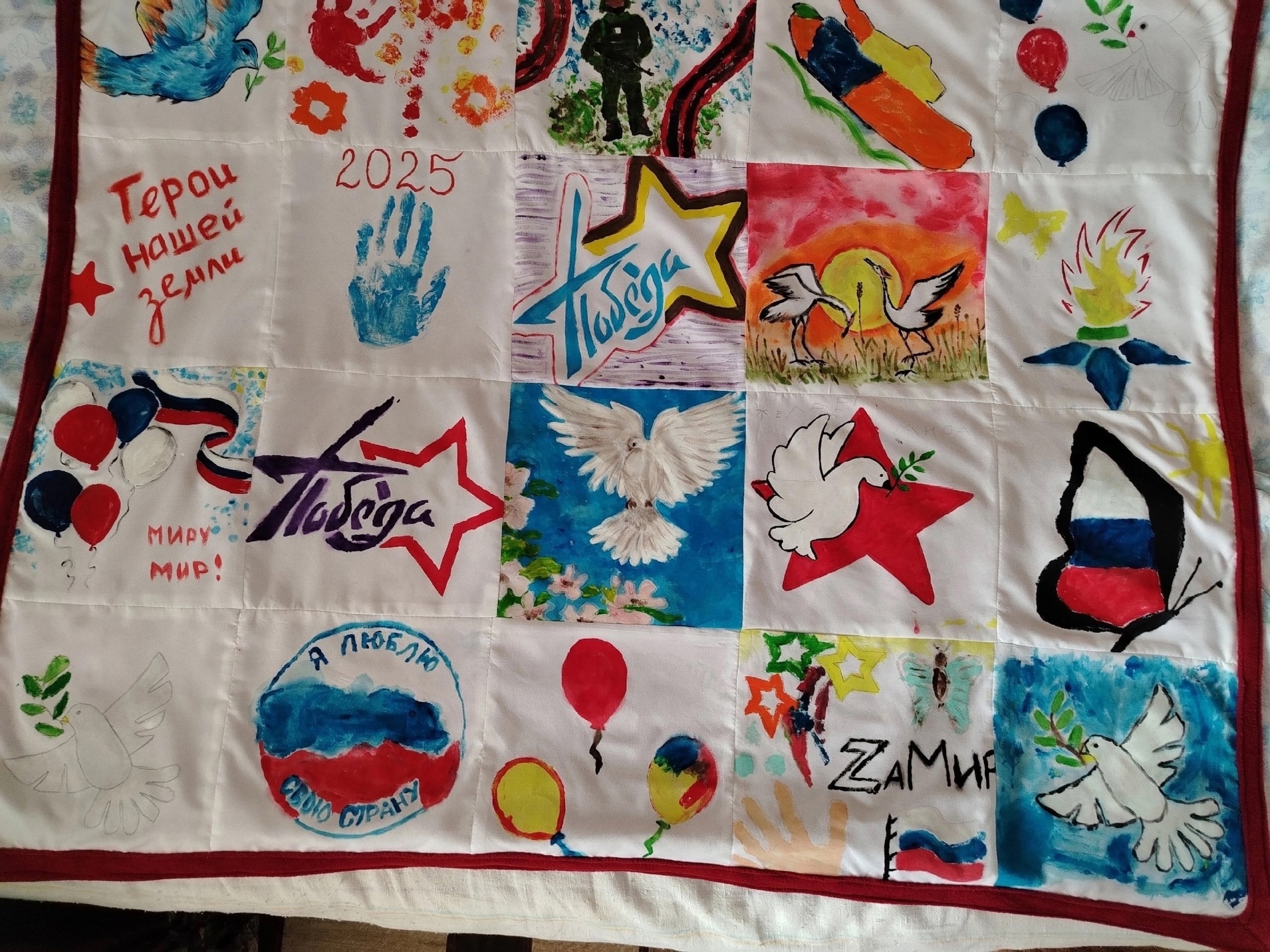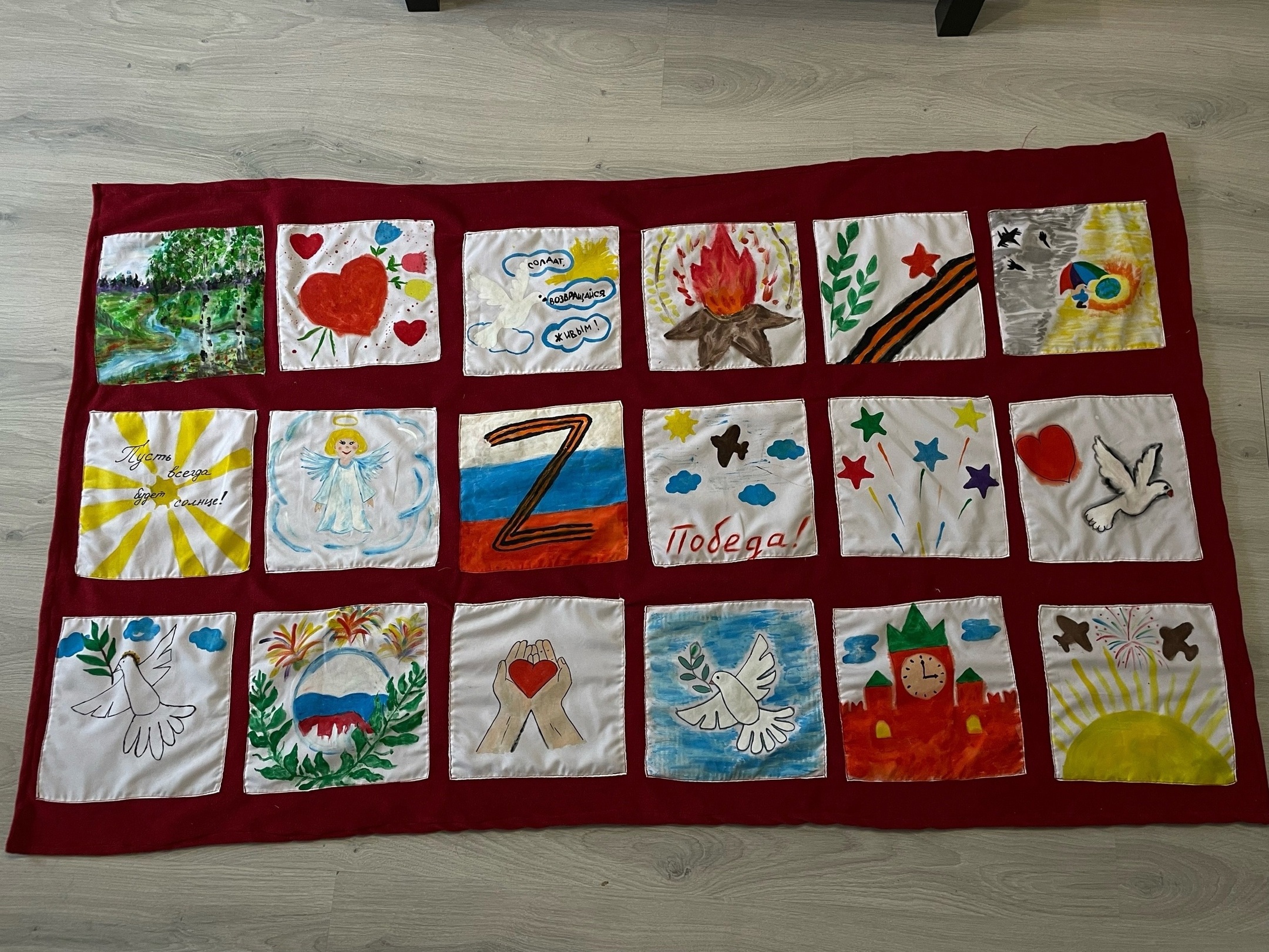 Цель благотворительной акции — создать одеяло для участников СВО, которое станет символом поддержки и единства, ведь каждый лоскуток с яркими рисунками и добрыми пожеланиями нагрет теплом сердец.