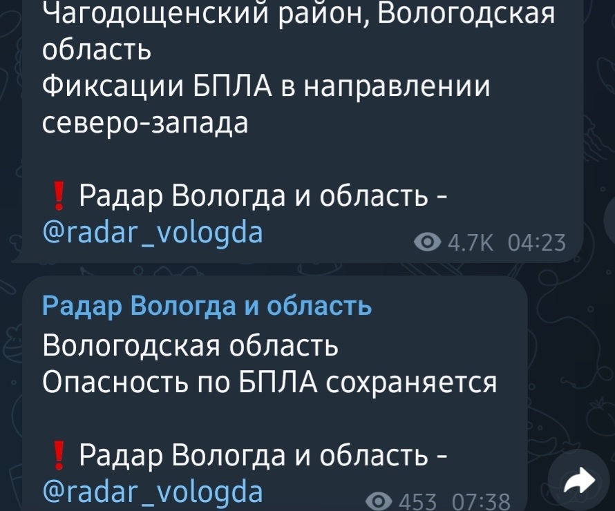 - 04:23 — Зафиксирован БПЛА в Чагодощенском районе (движение в направлении северо-запада).