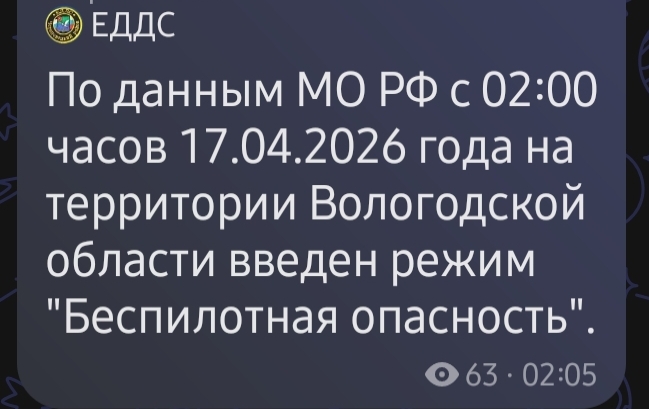 - 08:00 — Режим «Беспилотная опасность» отменён на территории Вологодской области.