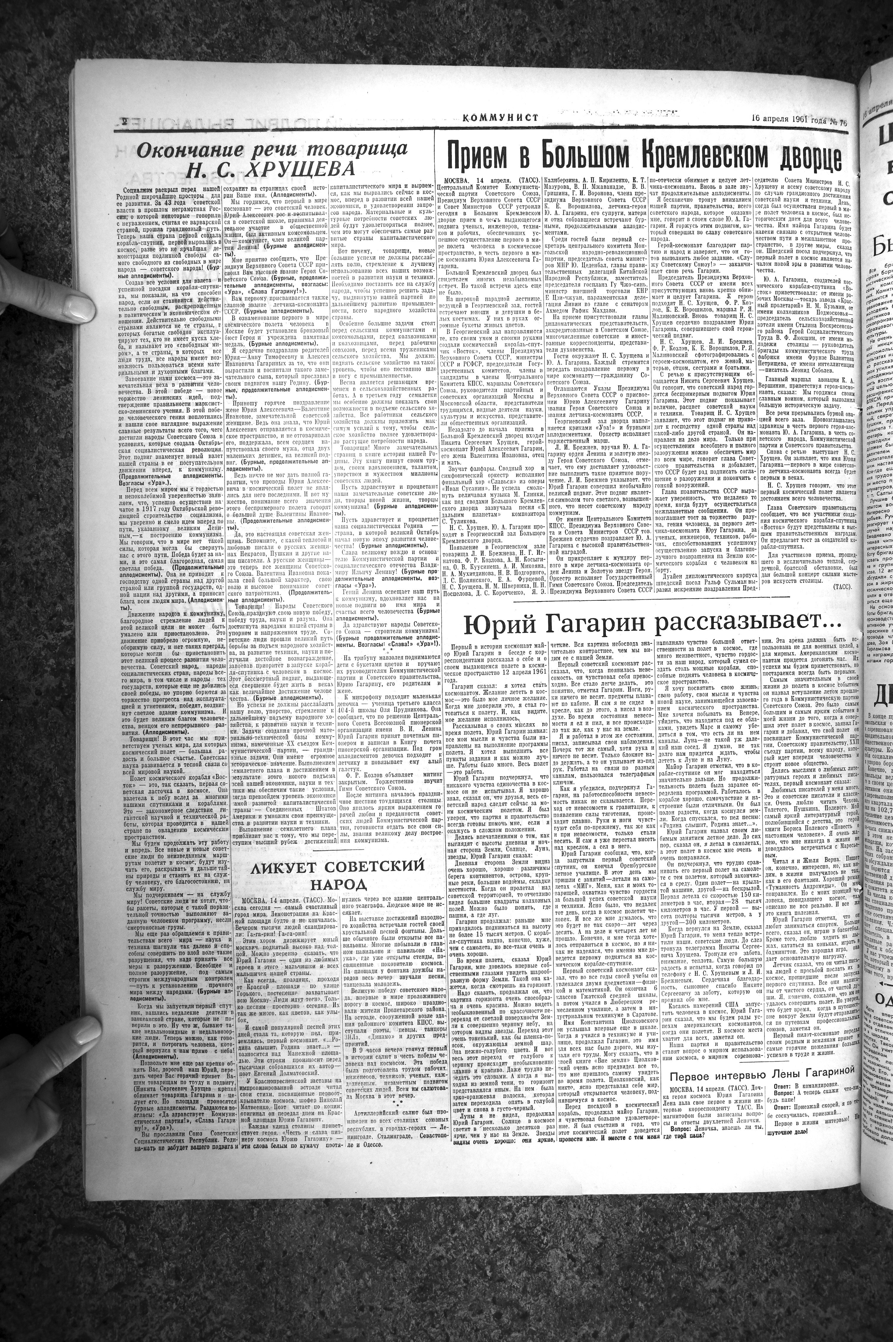В выпуске за 14 апреля опубликована беседа генсека и космонавта, которая больше напоминает интервью. Хрущев спрашивает, Гагарин отвечает. Две трети беседы представляют собой явную пропаганду достижений советского строя, и самыми живыми словами можно признать гагаринские: «Пусть теперь все страны догоняют нас!»